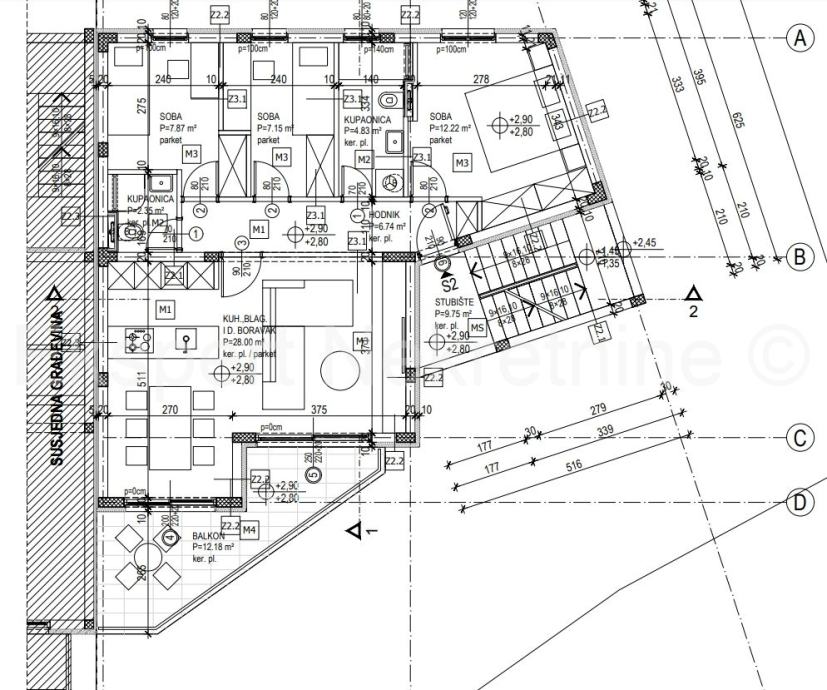 Stan ima 71.64 m2 stambene površine, tri spavaće sobe, dvije kupaone, hodnik, dnevni boravak s kuhinjom i blagovanom te balkon 12.8 m2.