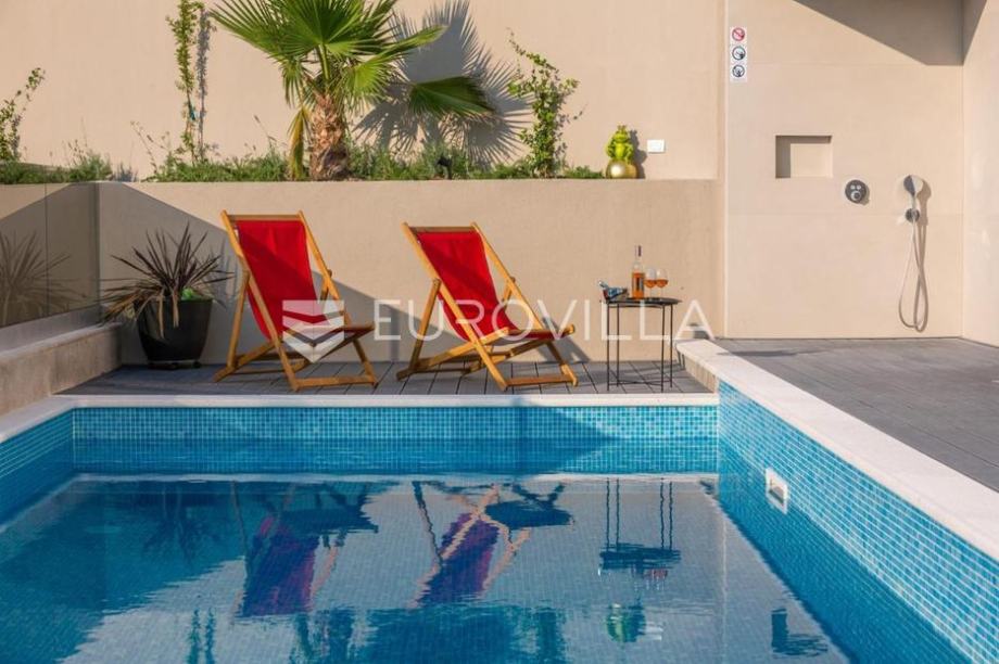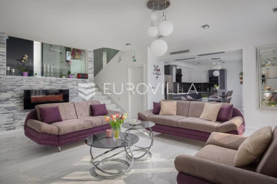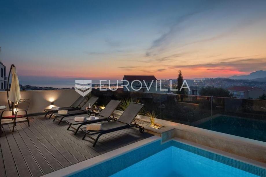 Split, Podstrana, luksuzna moderno opremljena vila s bazenom, četiri spavaće sobe, četiri kupaonice i vanjskim bazenom dostupna je za dugoročan najam.Vila bruto površine 326 m2 sastoji se od tri etaže povezane unutarnjim stubištem. U podrumu je smještena prostorija za igru I druženje. U...