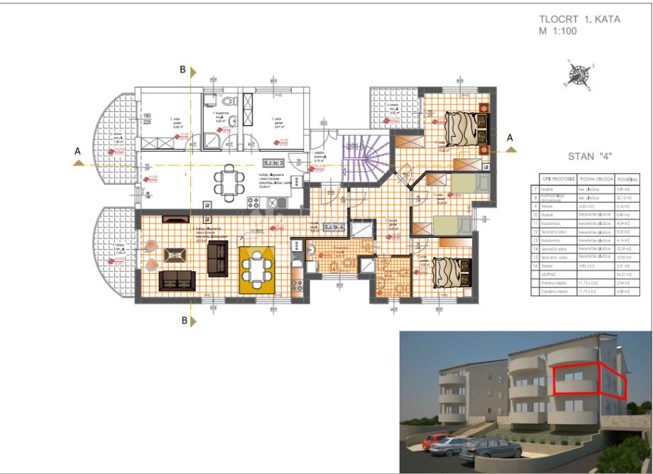 Ovaj prostrani apartman ima površinu od 114,63 m2 i nalazi se na prvom katu. Sastoji se od dvije kupaonice, tri spavaće sobe, open space prostora koji objedinjuje kuhinju, dnevni boravak i blagovaonicu te dvije natkrivene terase. Uz apartman dolazi i garaža te jedno nenatkriveno parkirno mjesto.