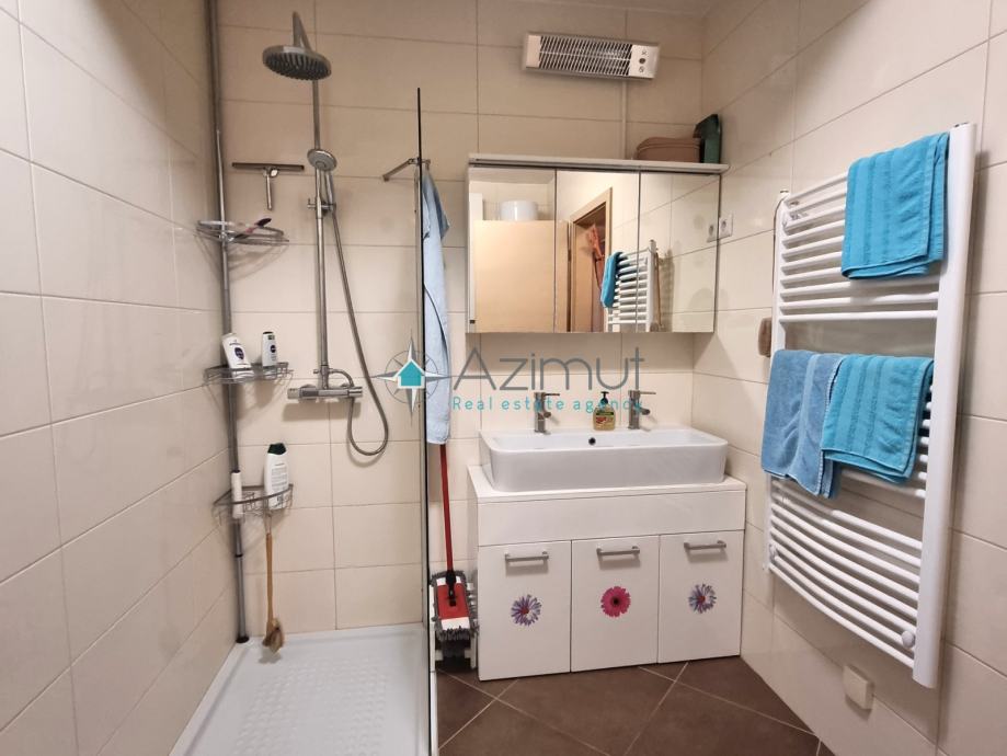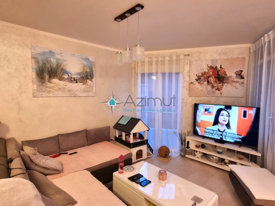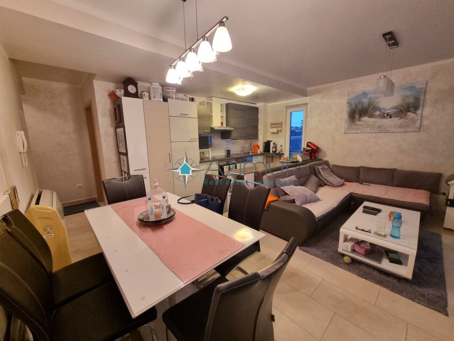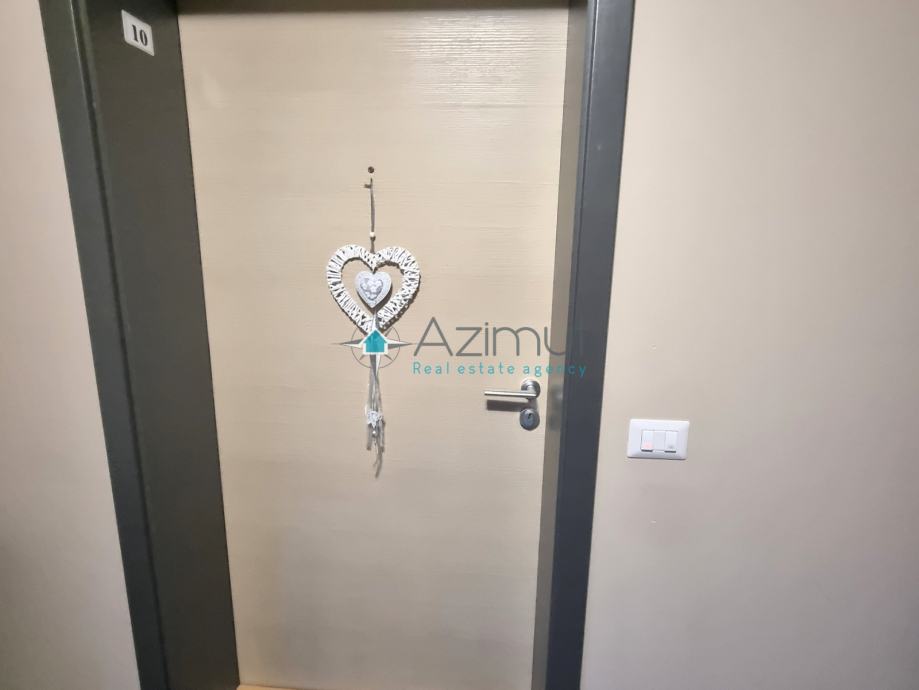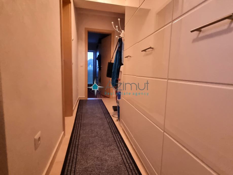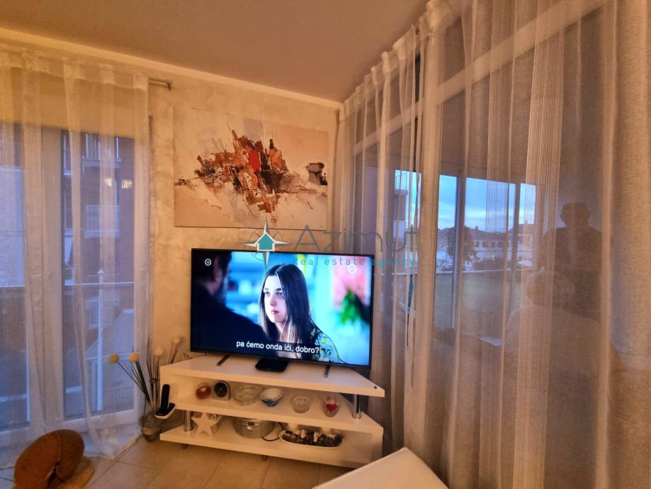 Stan se sastoji od open space dnevni boravak sa kuhinjom i blagavaonom , spavaca soba , hodnik na L i kupaona sa tus kadom , balkon sa predivnim pogledom na more i stari grad Umag !