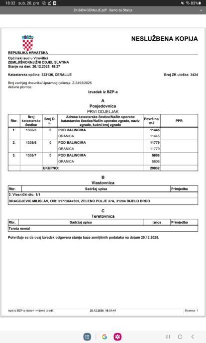 Prodaje se poljoprivredno zemljiste povrŝine 29000 m2 u jednom komadu u selu Balinci,Opĉina Mikleuŝ, na potesu sela zvanom Sloboŝtina,zemljiste se vodi kao oranica,ĉisto gruntovno vlasniŝtvo 1/1,zemljiste ima prilaz seoskim putem izravno na parcelu a samo zemljiŝte je udaljeno cca 250 metara od asvaltne ceste,izuzetna moguĉnost za sadnju viŝegodiŝnji nasada na navedenom poljoprivrednom zemljiŝtu zbog konfiguracije samog zemljista koje ima blagi nagib te idealno za sadnju voĉnjaka ili nasade ljeske.Sama veličina zemljiŝta od 5 katastarski jutara u jednom komadu buduĉem vlasniku omoguĉava laksu u jednostavniju obradu i odrzavanje zemljiŝa.Sama lokacija i položaj parcele te veličina parcele omogućavaju kupcu lako ostvarivanje poticaja za eko proizvodnju i dobivanje EU fondova za mlade poljoprivrednike s kojom bi mogao izvesti čitav projekat.Molim samo ozbiljne kupce