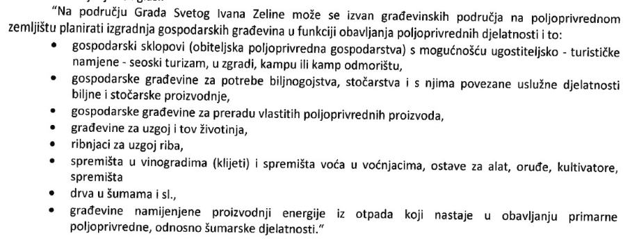 „Na području Grada Svetog Ivana Zeline može se izvan građevinskih područja na poljoprivrednom zemljištu planirati izgradnja gospodarskih građevina u funkciji obavljanja poljoprivrednih djelatnosti i to: