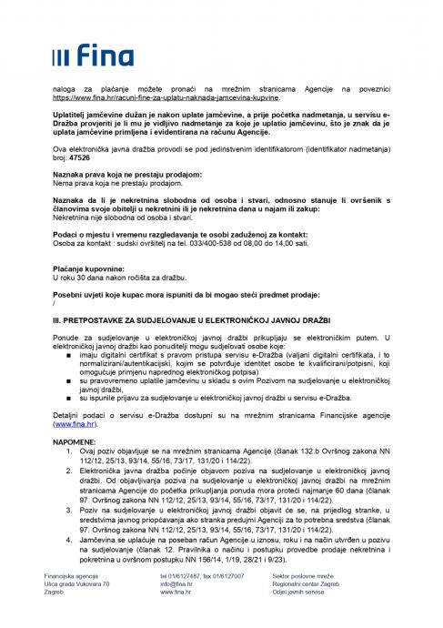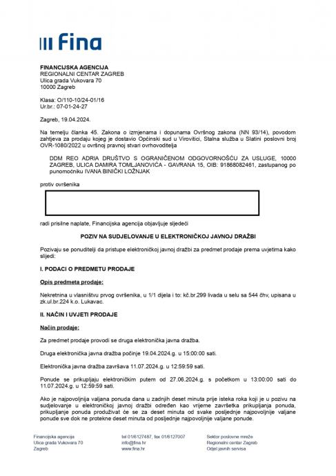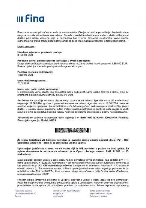 Druga elektronička javna dražba počinje 19.04.2024.g. u 15:00:00 sati.
