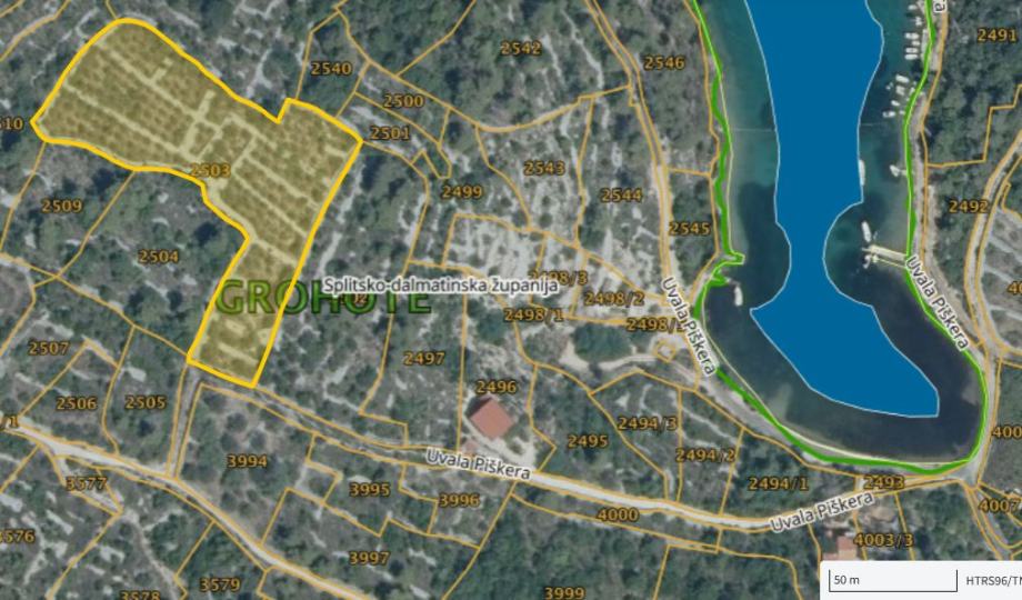 Poljoprivredno zemljište, iskrčeno - maslinjak, 8169 m2, sa 240 maslina. Zemlja je iznad uvale Piškera, cca 150 m od mora. Maslinjak je star cca 90 godina, a očišćen je i obnovljen pred 10 godina. Vlasništvo je čisto 1/1. Prodajem za 163380 eura (20 e/m2).