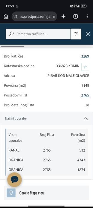 Poljoprivredno zemljište površine 7.149 m² nalazi se u katastarskoj općini Komin, na adresi Ribar kod Male Glavice, uz rijeku Neretvu.Ukupno oko 6.617 m²) i kanal (532 m²). Teren je ravan, što olakšava obradu i korištenje.