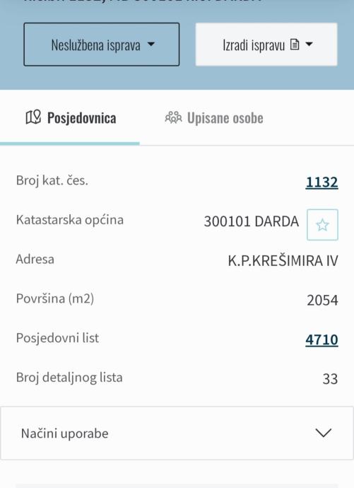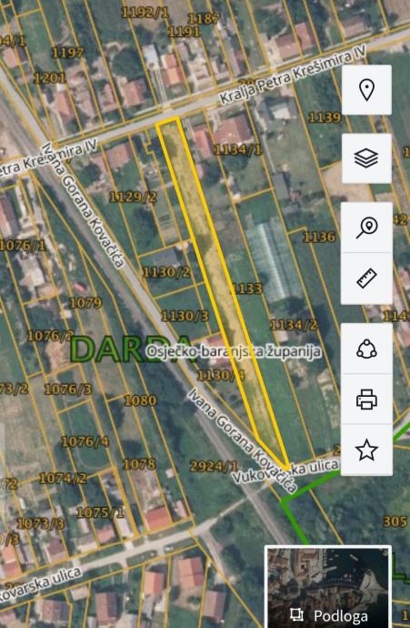 Prodajemo građevinsko zemljište u Dardi. Izlaz na dvije ulice. Na jednoj strani plac je ograđen i na njemu je plastenik. Na sredini placa je probušen bunar. Ispred se nalaze svi priključci (struja, voda, plin i kanalizacija). Može se podjeliti na dvije zasebne parcele.