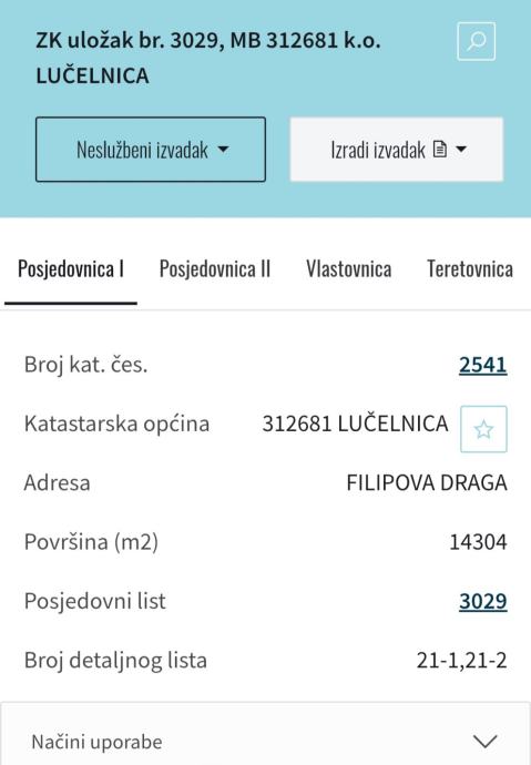 Prodaje se poljoprivredno zemljište u katastrarskoj općini Lučelnica, na adresi Filipova Draga. Površina parcele iznosi 14.304 m², što je vidljivo iz zemljišnoknjižnog uloška br. 3029. Katastarska čestica nosi broj 2541.