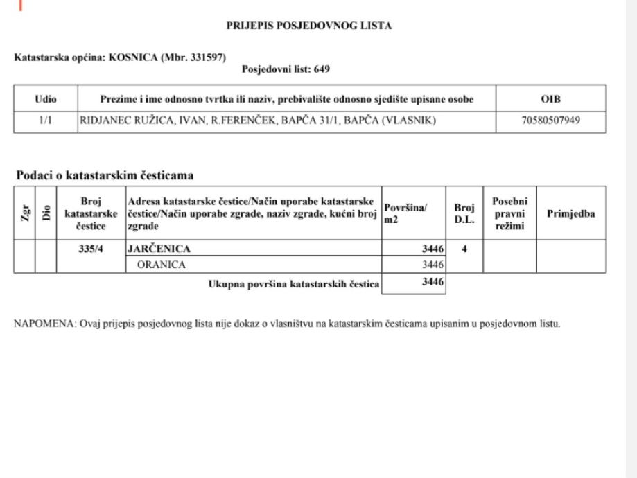 Prodaje se poljoprivredno zemljište 3446 m² u naselju Petina. U blizini autoceste i čvora kosnica, zračne luke na izlazu sa velikogoricke obilaznice za ščitarjevo iza prvih stambenih kuća. Zemljiste je pravokutnog oblika, prilaz zemljistu je sa makadamskog puta između dvije obiteljske kuće kućnog broja 15 L. Zemljište je u vlasnistvu 1/1 u gruntovnici od 2020 godine. Broj čestice 335/4 katastarska općina Kosnica. Cijena 15 €/m². Upiti na broj 0923777243