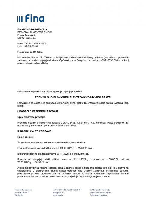 Prva elektronička javna dražba počinje 03.09.2025.g. u 15:00:00 sati.