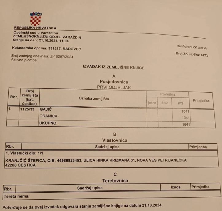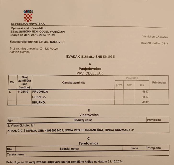 Na prodaju je zemljište ukupne površine 5.658 m², koje se sastoji od dvije katastarske čestice – 1125/10 i 1125/13, smještene u naselju Radovec Polje, nadomak Slovenije 3 km i Varaždina 15km. Dio zemljišta nalazi se unutar građevinske zone, dok je preostali dio poljoprivredne namjene.