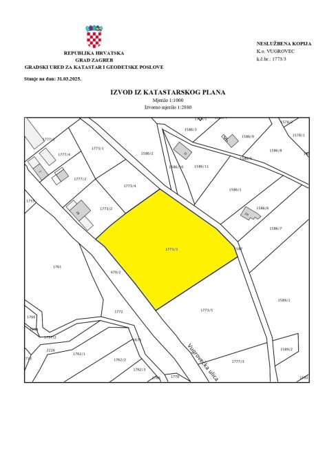 Prodaje se poljoprivredno zemljište k.č.br. 1773/3 k.o. Vugrovec, površine 3595 m2, pravilnog kvadratnog oblika, odmah uz cestu. Planirana je prenamjena u građevinsko. 10 EUR/m2