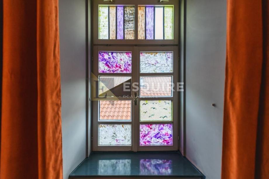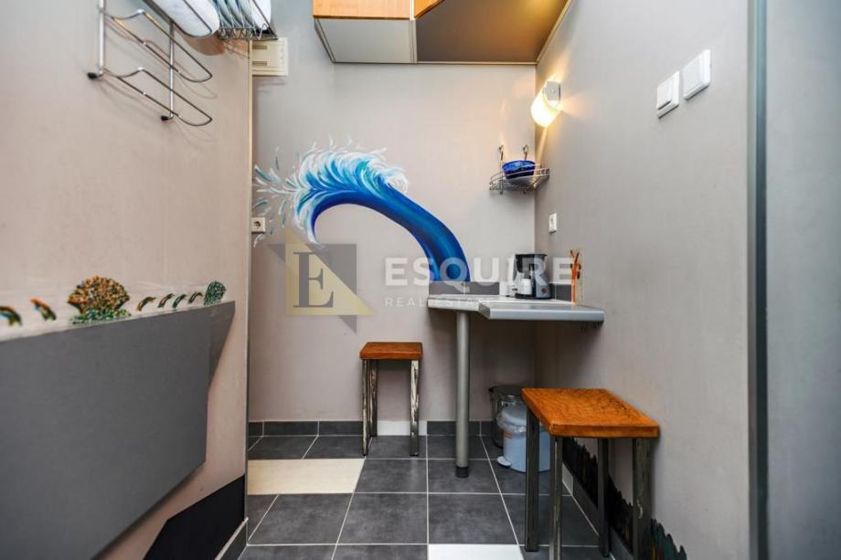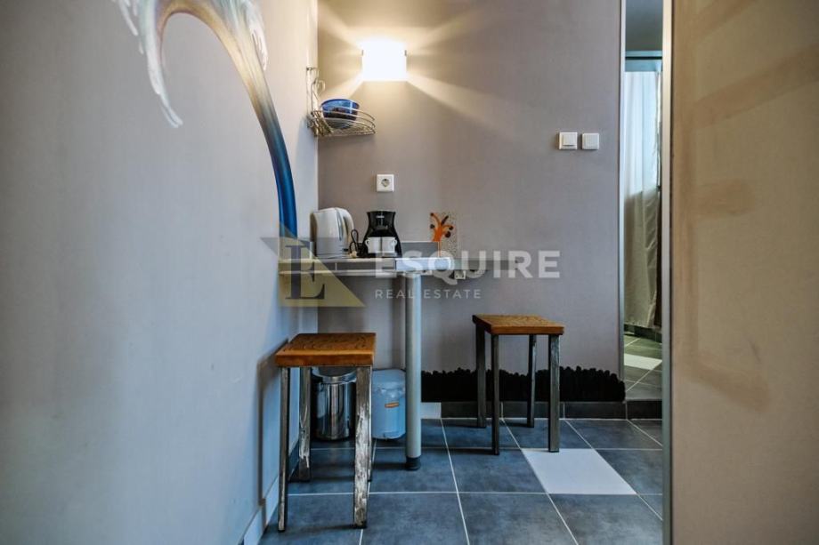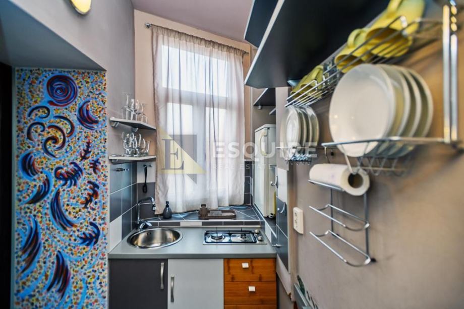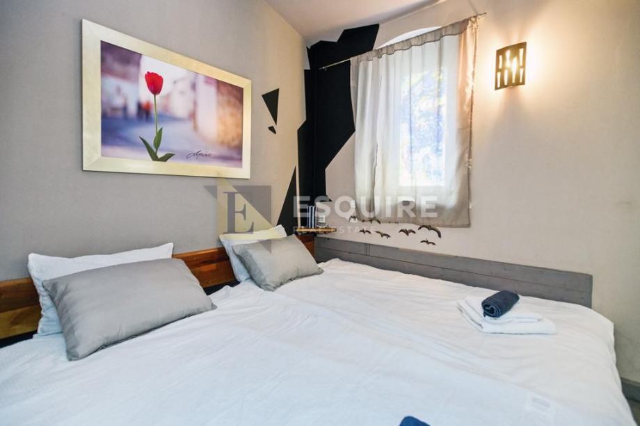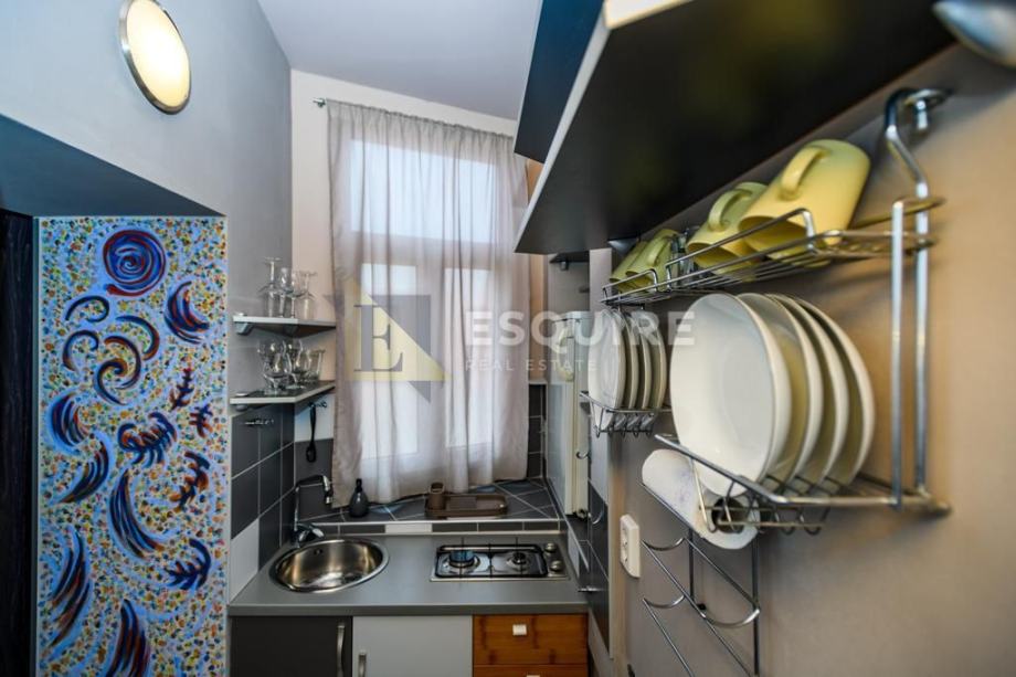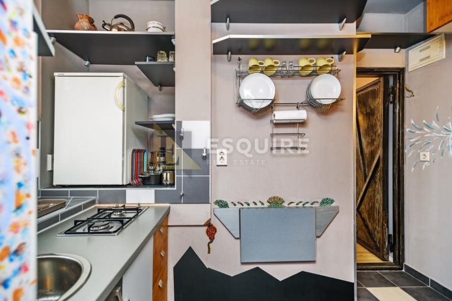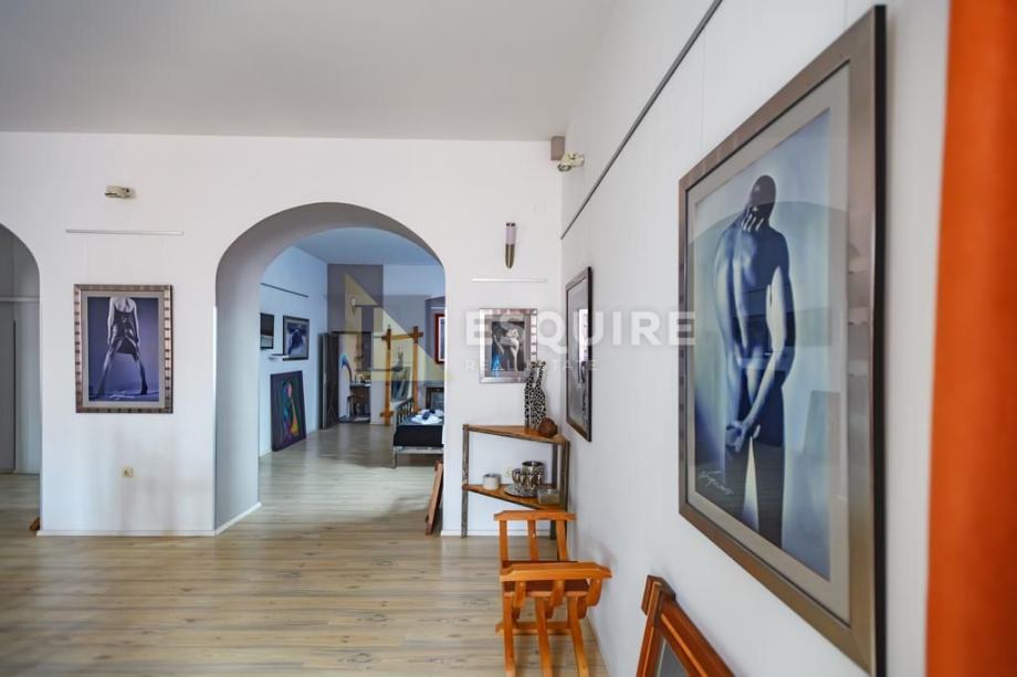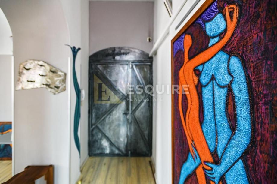 Ulazni hodnik vodi u prostrani dnevni prostor s visokim stropovima, podijeljen u dvije cjeline. Desno, kroz dva arkadna prolaza, dolazi se do galerijskog dijela ispunjenog umjetninama i velikim stolom, idealnim za druženja ili rad. Lijevo se nalazi ručno izrađen krevet te ulaz u potpuno opremljenu kuhinju. Dodatni mali hodnik vodi do zasebne spavaće sobe i moderno uređene kupaonice.