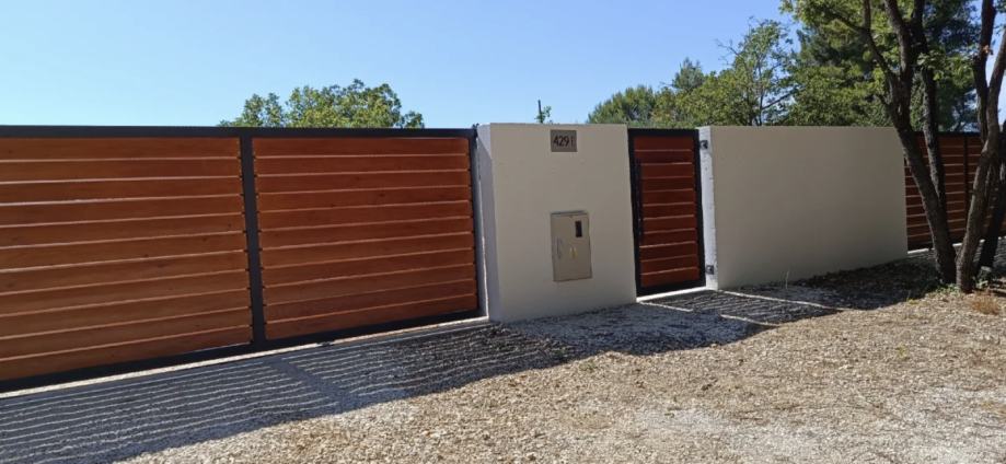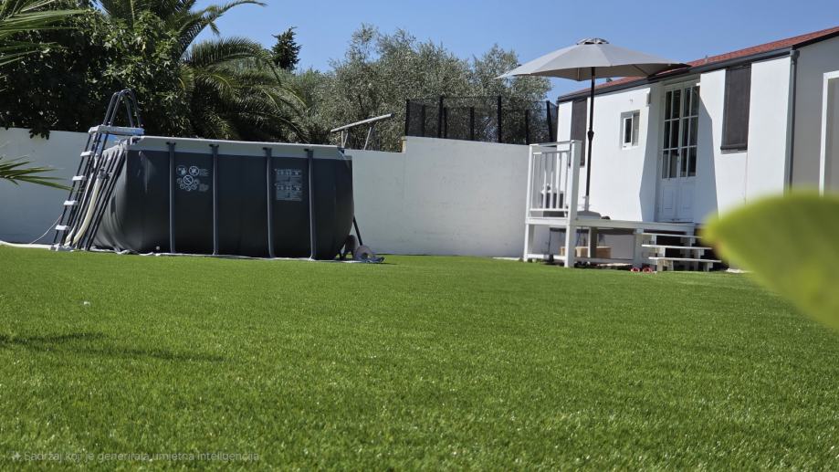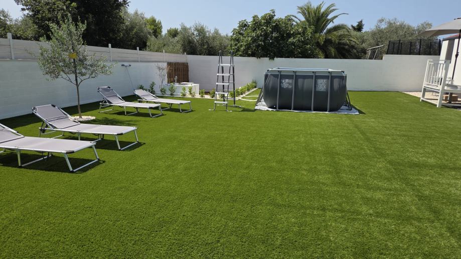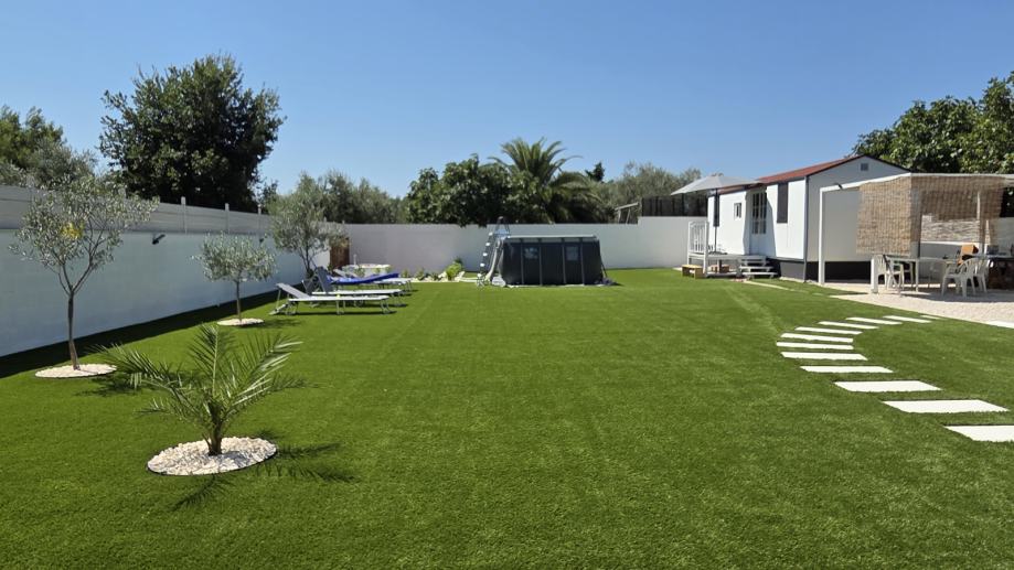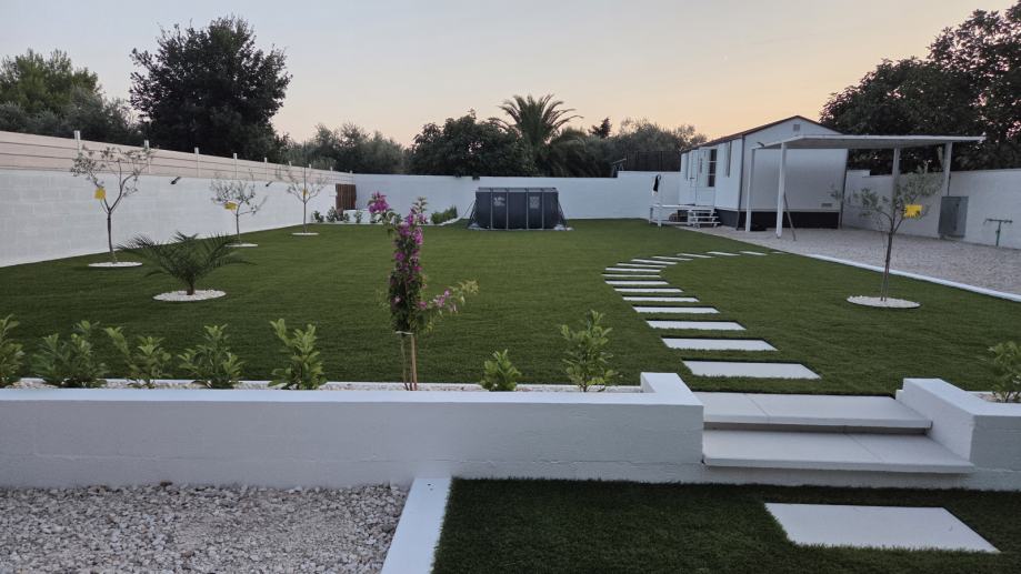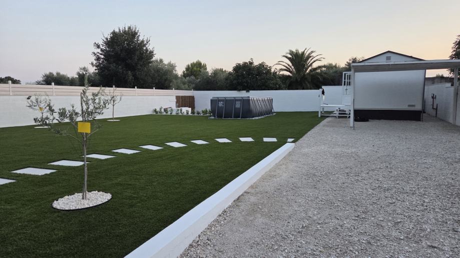 Na parceli je posadeno 6 mladih maslina , palma , bungavilija i lovor visnja dok je na tlo postavljena umijetna trava.
