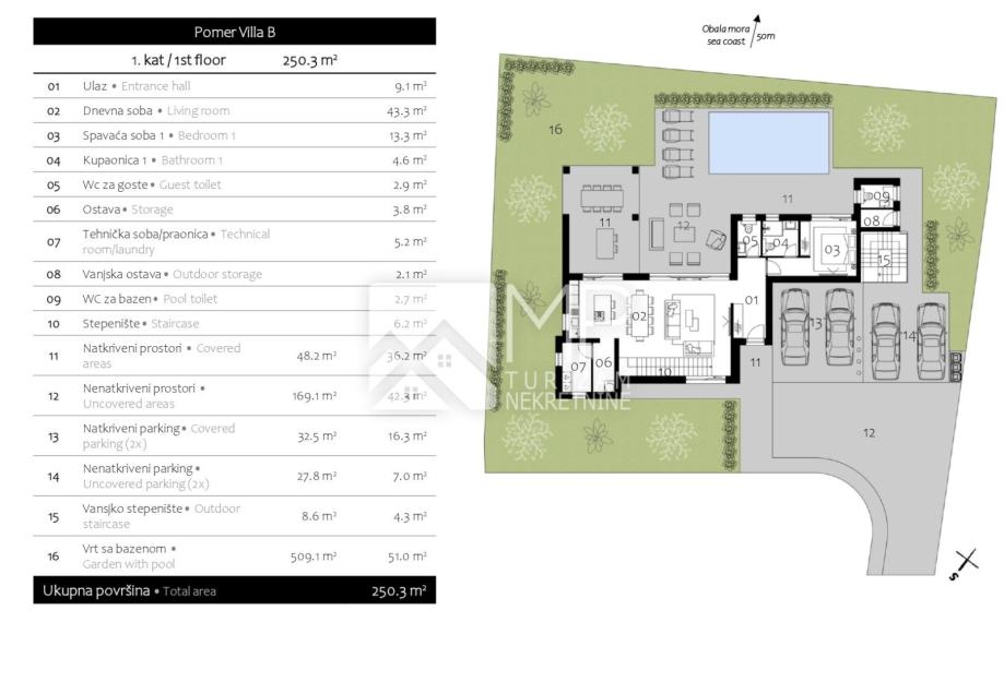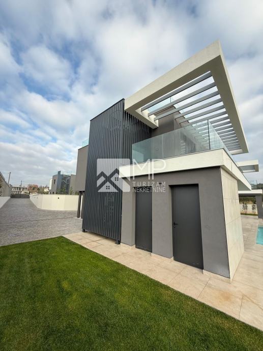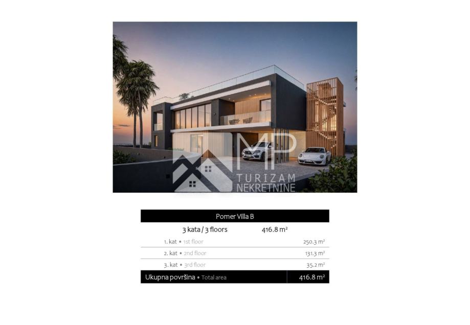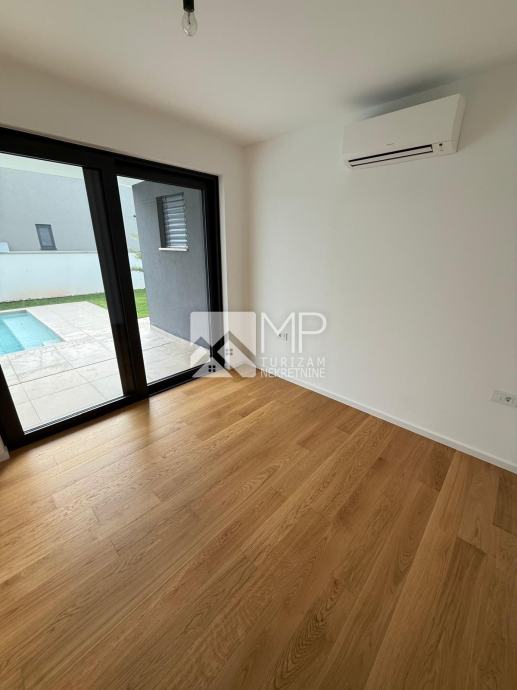 Prizemlje – 250,30 m2 - Ulazni hodnik, prostrani dnevni boravak, spavaća soba s kupaonicom, gostinjski WC, ostava, tehnička soba / praonica, WC za bazen, natkrivene i nenatkrivene terase, bazen i uređena okućnica, natkrivena i nenatkrivena parkirna mjesta