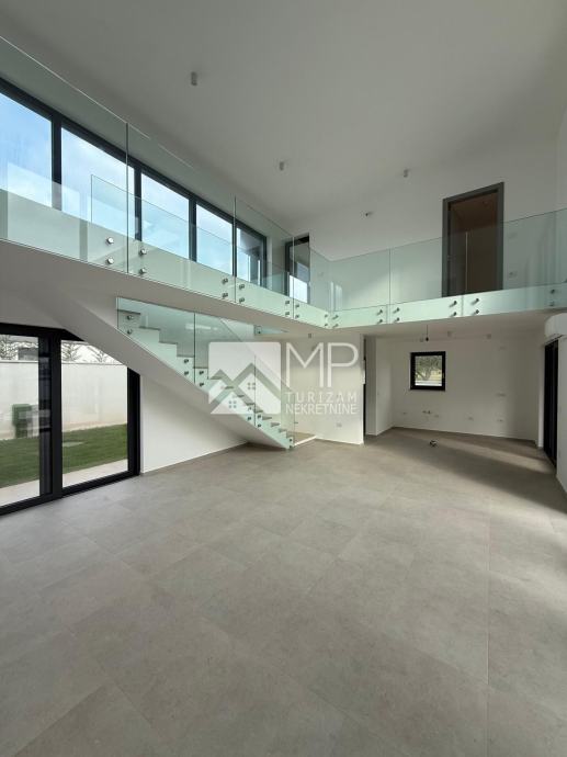 Srce vile čini impresivan dnevni boravak s visinom stropa od 6 metara, dodatno naglašen unutarnjom galerijom koja prostoru daje iznimnu prozračnost i luksuzni karakter. Talijanske pločice i vrata, Grohe kupaonska oprema i parket u spavaćim sobama osiguravaju vrhunsku kvalitetu života. Vila je opremljena podnim grijanjem i klimatizacijom u svim prostorijama, dok premium aluminijski prozori pružaju izvrsnu izolaciju i predivan pogled.