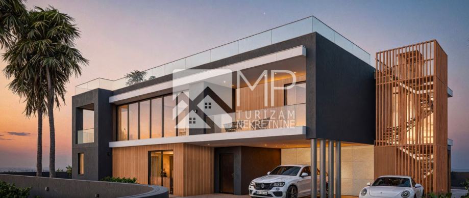 Vila se nalazi na parceli od 814 m² i raspoređena je na tri etaže, uključujući krovnu terasu.