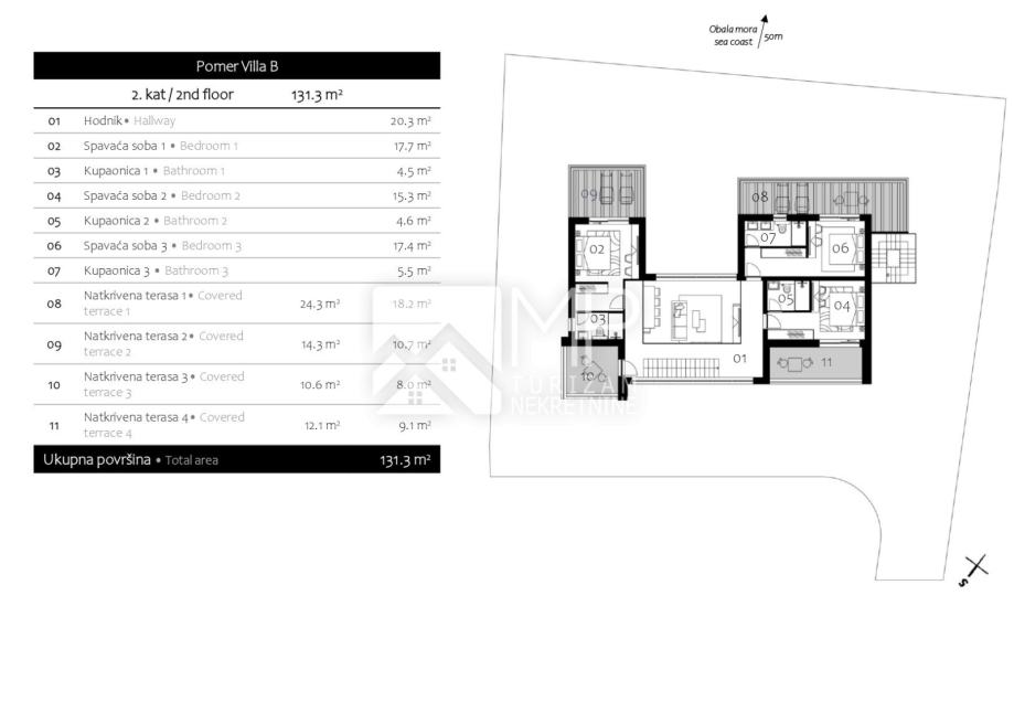 1.kat - 131,30 m2 - Hodnik, 3spavaće sobe, svaka s vlastitom kupaonicom. 4 natkrivene terase s pogledom na more