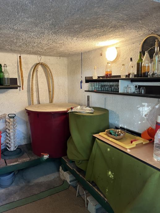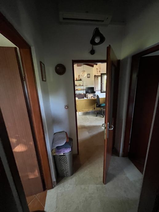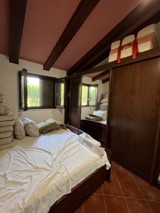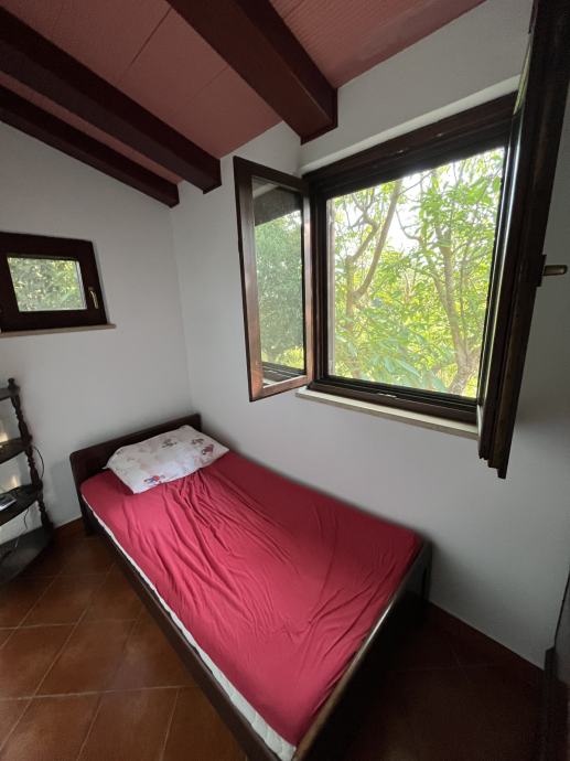 Kuća (10 km od Poreča) se sastoji od 2 spavaće sobe (manje i veće), velikog dnevnog boravka s malenom kuhinjom, kupaonice, terase i malog spremišta za alat i kosilicu. Ispod kuće je konoba (prilaz iza kuće) za čuvanje vina, pršuta i drugih namirnica jer je prostorija ljeti hladna, a zimi ugodne temperature bez većih oscilacija.