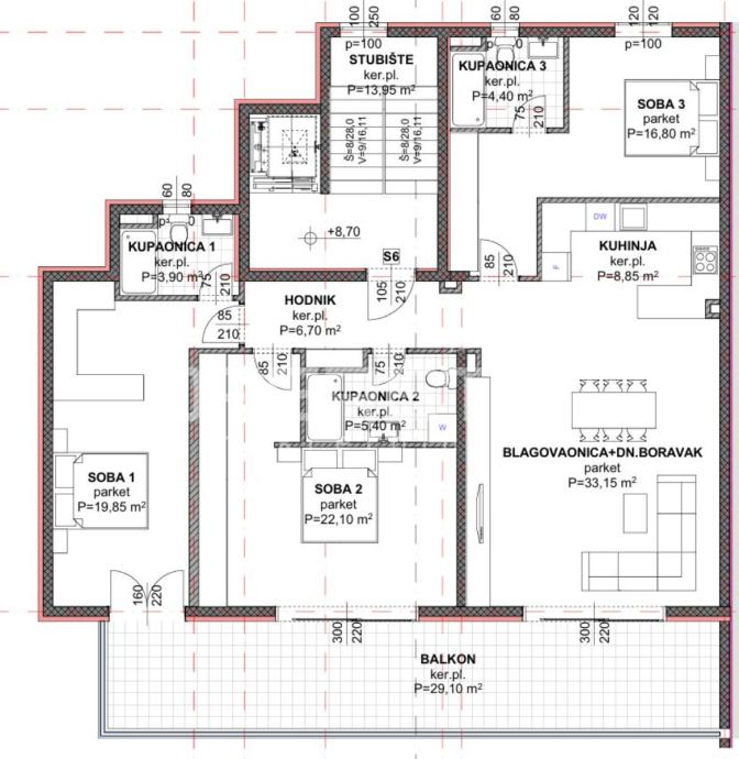 kupaonica 2 - 4,40m2, kupanica 3 - 4,40m2, soba 1 - 19,85m2, soba 2 - 22,10 m2, soba 3 - 16,90m2.