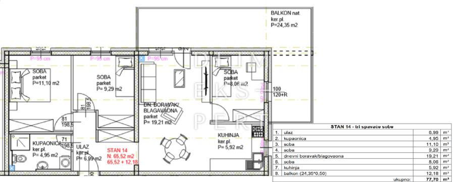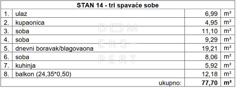 - ukupna površina stana iznosi 77.70 m² s balkonom površine 24.35 m² obračunato prema pripadajućim koeficijentima (12.18 m²).