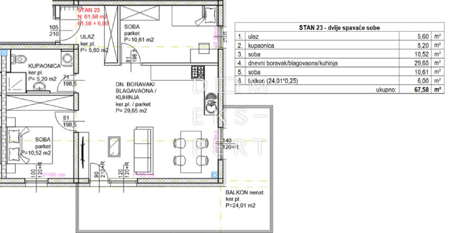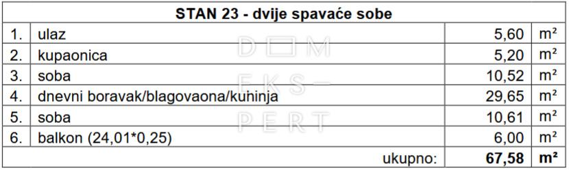 - ukupna površina stana iznosi 67.58 m² s balkonom površine 24.01 m² obračunato prema pripadajućim koeficijentima (6 m²).