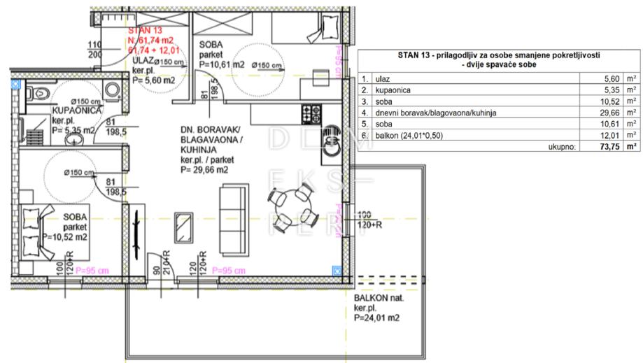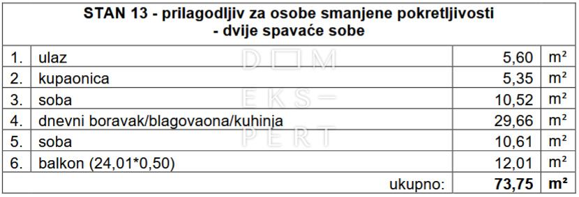 - ukupna površina stana iznosi 73.75 m² s balkonom površine 24.01 m² obračunato prema pripadajućim koeficijentima (12.01 m²).