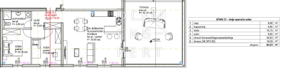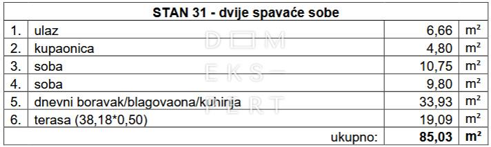 - ukupna površina stana iznosi 85.03 m² s terasom površine 38.18 m² obračunato prema pripadajućim koeficijentima (19.09 m²).