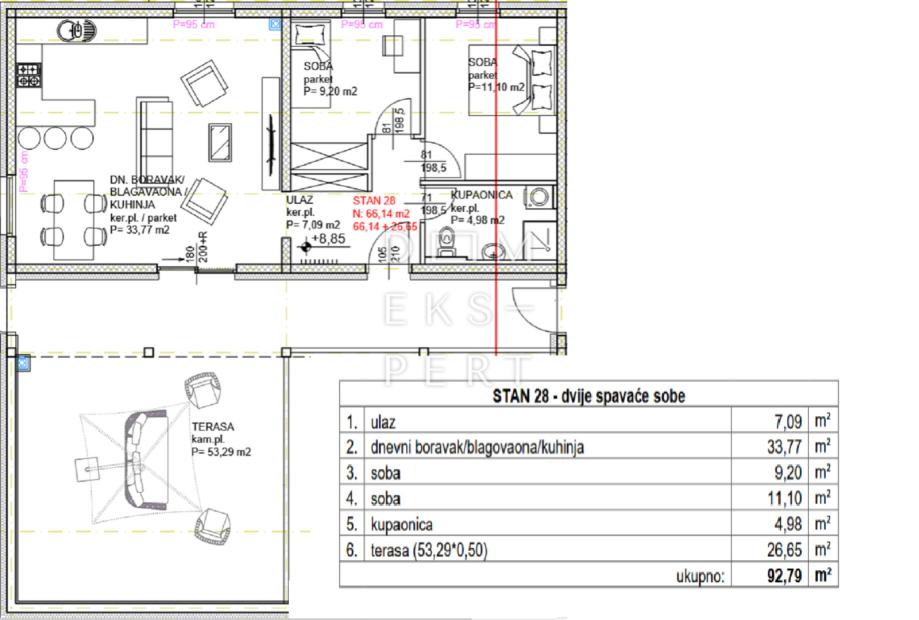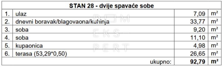 - ukupna površina stana iznosi 92.79 m² s terasom površine 53.29 m² obračunato prema pripadajućim koeficijentima (26.65 m²).