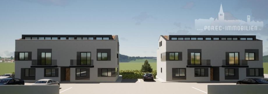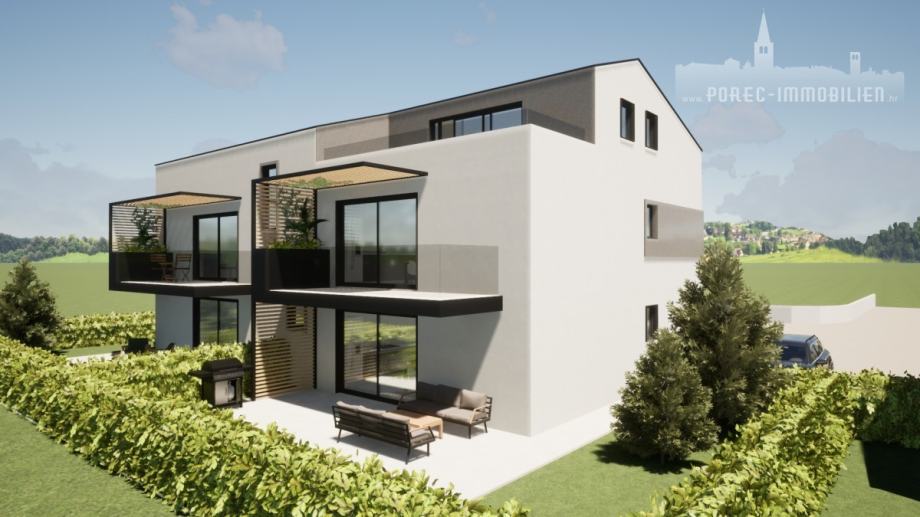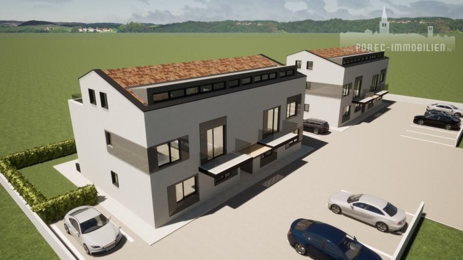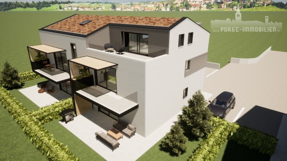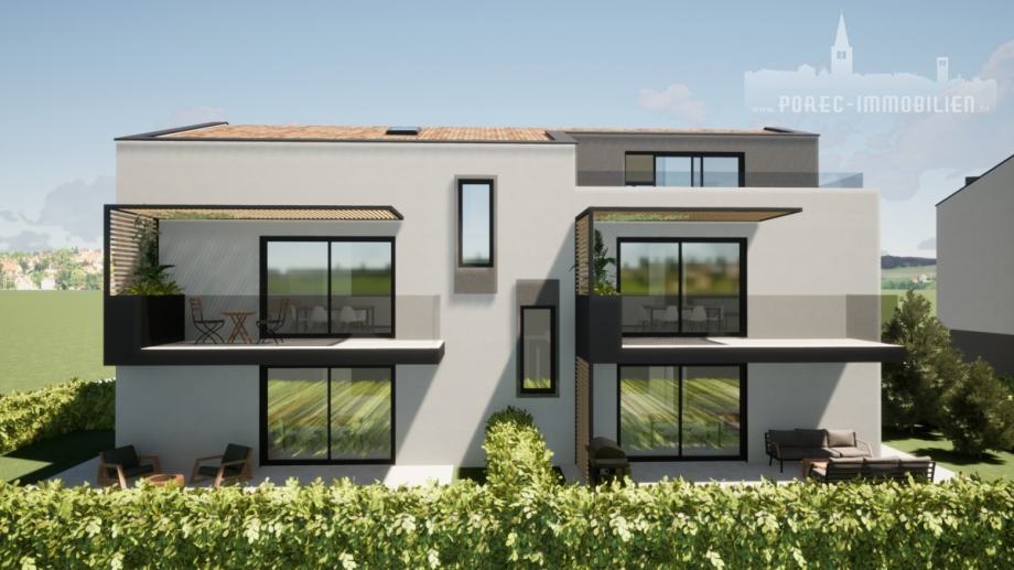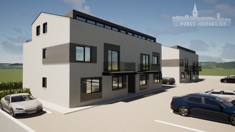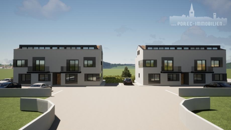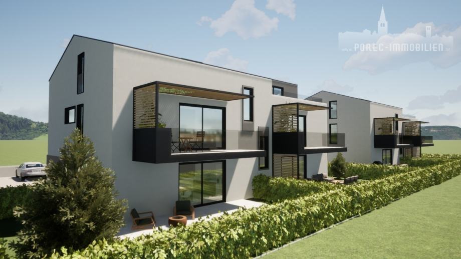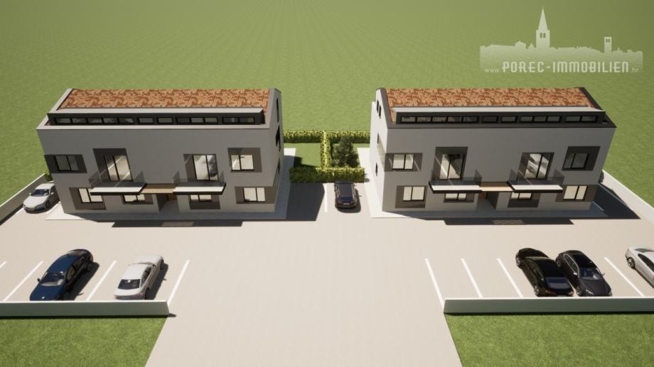 Na samo 2 km od Poreča i prekrasnih plaža, u tijeku je izgradnja dvije manje moderne zgrade, a svaka zgrada će se sastojati od 5 stambenih jedinica. Na prvom katu se nalazi stan od 72,10 m2, a sastoji se od kuhinje i dnevnog boravka sa izlazom na terasu, dvije spavaće sobe od kojih veća ima izlaz na balkon, kupaone i wc-a za goste.