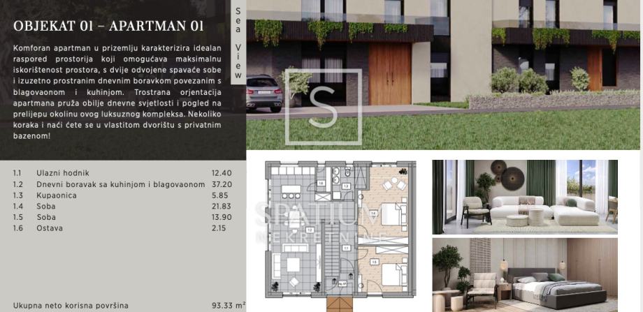Stan se nalazi u prizemlju. U svojih 94m2 interijera, rasporedile su se dvije spavaće sobe, ostava, hodnik, kupaonica, "open space" kuhinja s blagovaonicom i dnevnim boravkom iz kojega se izlazi na veliku okućnicu veličine 150m2 s bazenom 21m2.