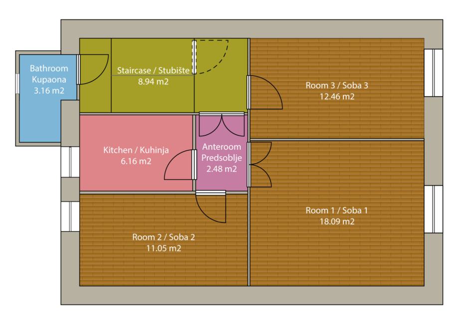 It is located on the 2nd floor of a two-story residential building (top floor). The building shares the entrance with one other apartment, which is a tourist apartment. The apartment can also be converted for tourist rental purposes. In that case, renovation is required.