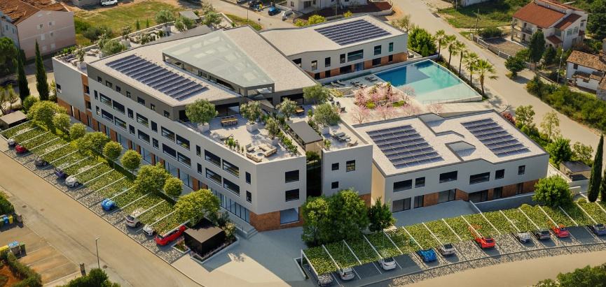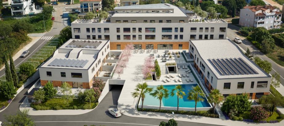 Zgrada u kojoj se stan nalazi jest stambeno-poslovne namjene, podijeljena je u tri jedinice, centralni, južni i sjeverni volumen. Ukupno će imati 78 stanova i 18 poslovnih jedinica. U objektu se nalazi bazen i podzemna garaža.