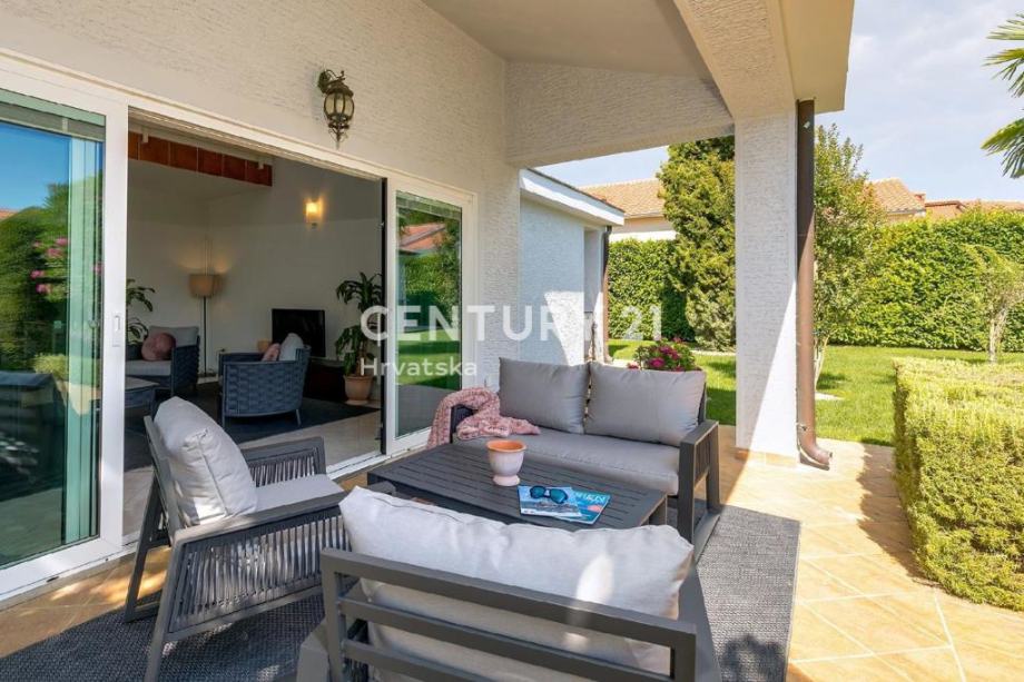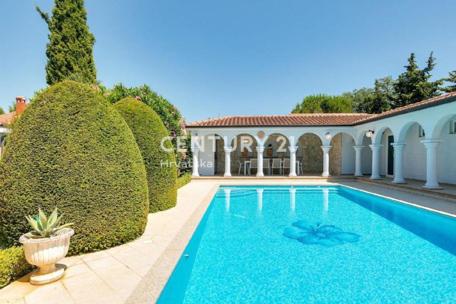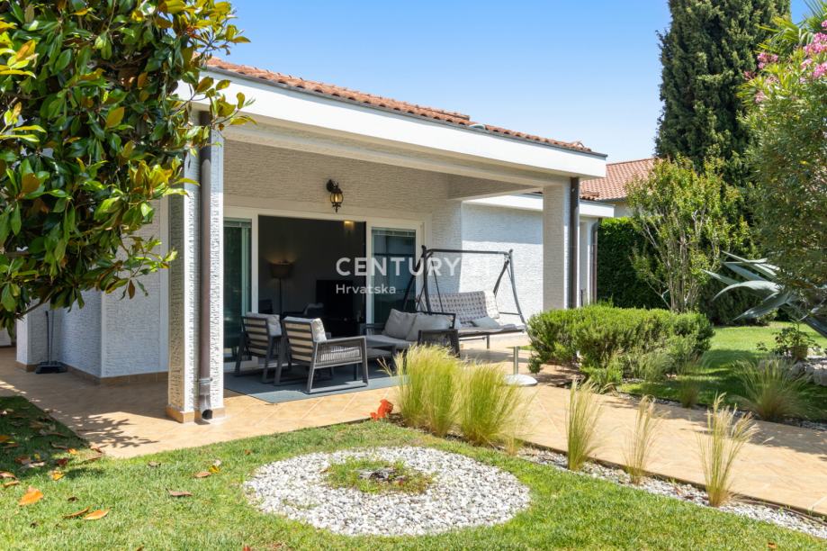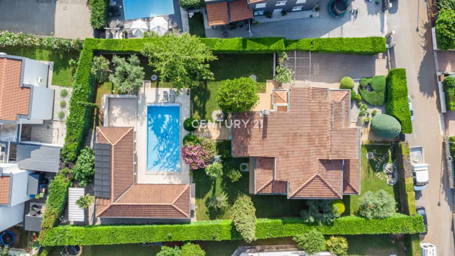 Okućnica se prostire na ukupno 1353 m2, s njegovanim engleskim travnjakom, prekrasnim bazenom od 50 m2 i parkiralištem za 3-4 automobila.