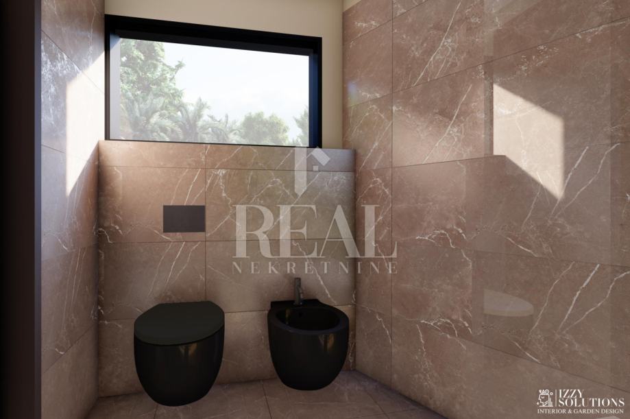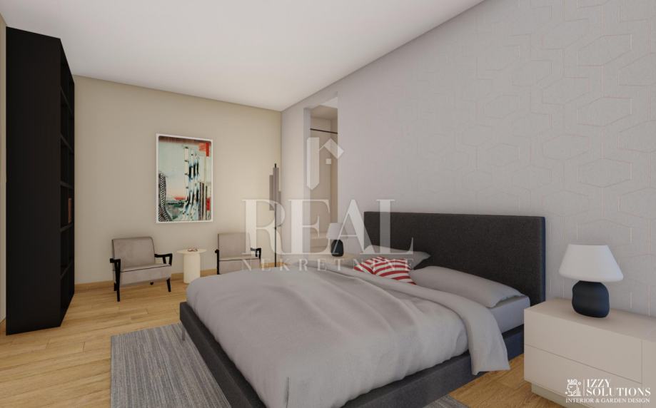 Apartman udaljen od mora 400 metara u novogradnji koji se sastoji od kuhinje sa dnevnim boravkom, spavaće sobe, master spavaće sobe sa vlastitom kupaonicom, sanitarnim čvorom , terasom i okućnicom 35 m2. Sva keramika je Talijanska u prvoj klasi, u kupatilima i toaletima je mramorna keramika velikog formata a sanitarije su Vileroy & Boch, Hans Grohe, Laufen... Stolarija je aluminijmska velikih formata koja je skoro na svim otvorima od poda do plafona te su svi otvori izvor velike količine svjetlosti, sa elektro aluminiskimskim roletnama, komarnicima .Apartman ima grijanje na struju i klimatizirani inverterskom klimom za grijanje i hlađenje. Parkirno mjesto.