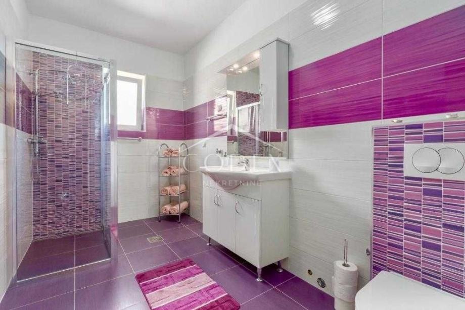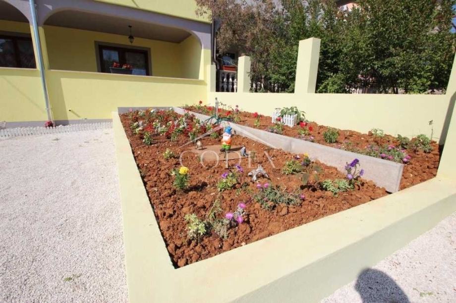 Kuća veličine skoro 400 m2 je troetažna s dvosobnim stanom u prizemlju i drugom katu te jednosobnim stanovima na prvom i drugom katu koji su povezani natkrivenom terasom.