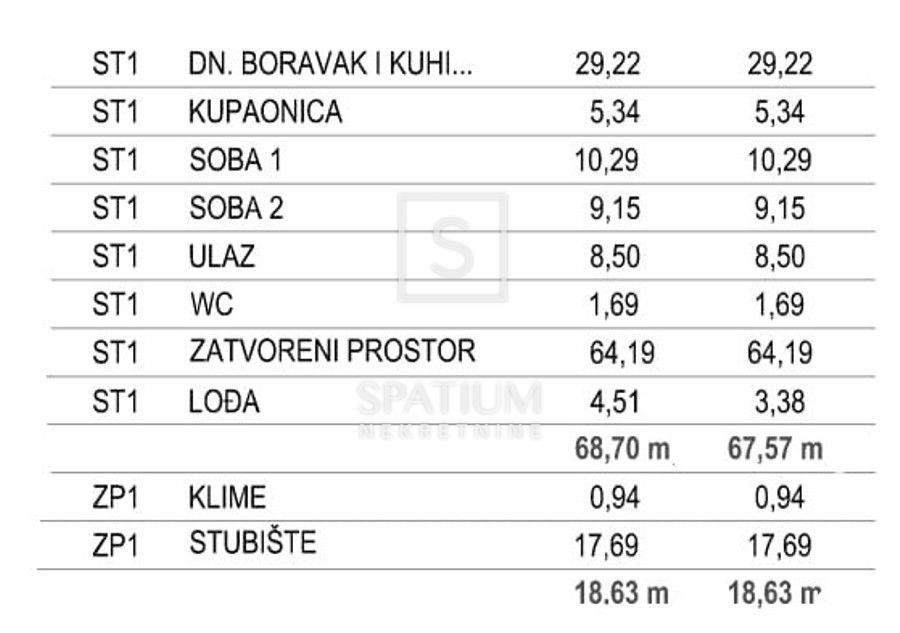 Stan se prostire na ukupno 68,70 m², odnosno 67,57 m² obračunske površine, a sastoji se od prostranog dnevnog boravka s kuhinjom i blagovaonicom, dvije spavaće sobe, kupaonice, zasebnog WC-a, ulaznog prostora te lođe od 4,51 m² koja dodatno obogaćuje stambeni prostor i nudi mogućnost opuštanja na otvorenom.