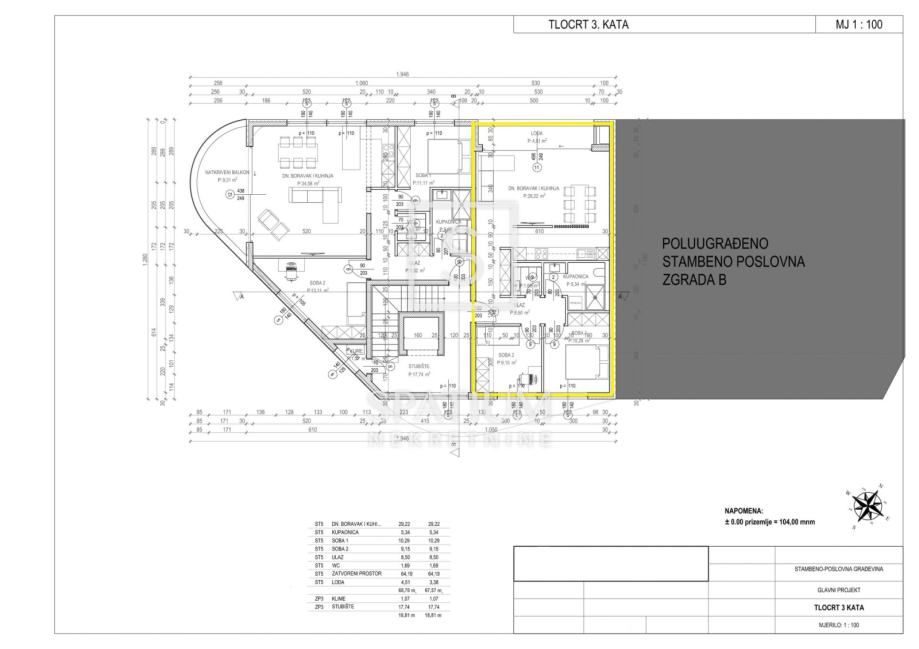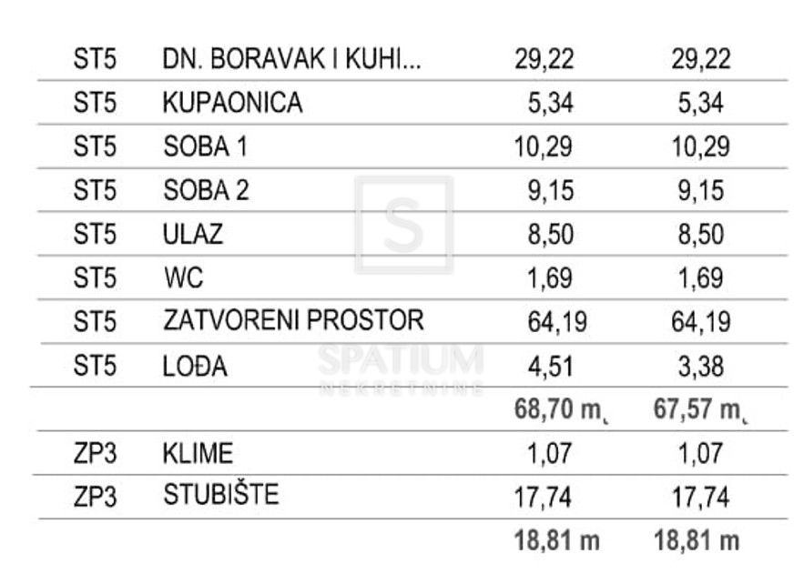 Stan se prostire na ukupno 68,70 m², odnosno 67,57 m² obračunske površine, a sastoji se od prostranog dnevnog boravka s kuhinjom i blagovaonicom, dvije spavaće sobe, kupaonice, zasebnog WC-a, ulaznog prostora te lođe od 4,51 m² koja dodatno obogaćuje stambeni prostor i nudi mogućnost opuštanja na otvorenom.