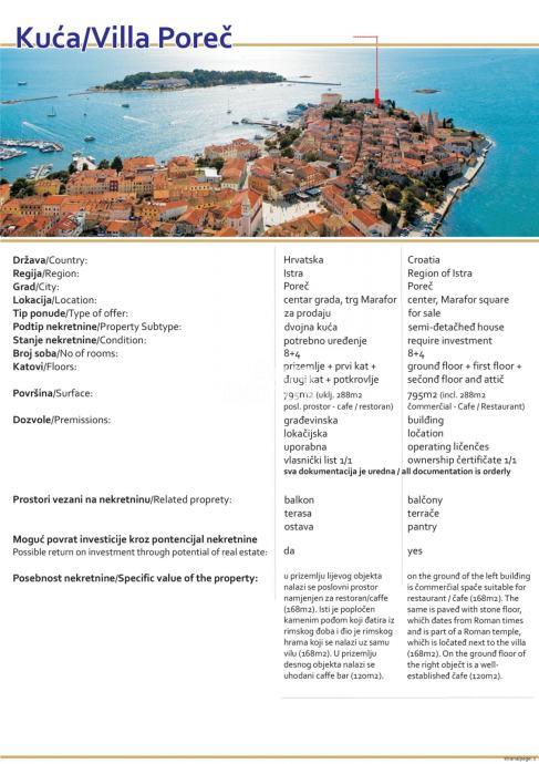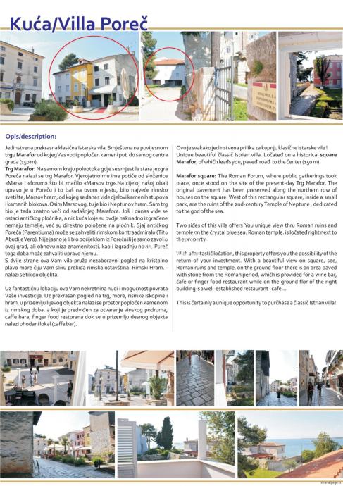 Jedinstvena prekrasna klasična Istarska vila. Smještena na povijesnom trgu Marafor od kojeg Vas vodi popločen kameni put do samog centra grada (150 m). Dvojna kuća potrebno uređenje 8+4, prizemlje + prvi kat + drugi kat + potkrovlje. 795m2 (uklj. 288m2posl. prostor - cafe / restoran). (Na slikama ŽUTA KUĆA I DO NJE LIJEVA)