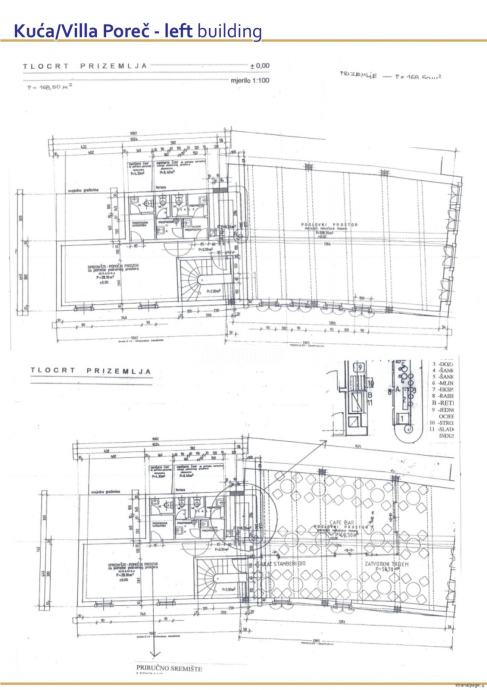 u prizemlju lijevog objekta nalazi se poslovni prostor namjenjen za restoran/caffe (168m2). Isti je popločen kamenim podom koji datira iz rimskog doba i dio je rimskog hrama koji se nalazi uz samu vilu (168m2). U prizemlju desnog objekta nalazi se uhodani caffe bar (120m2)
