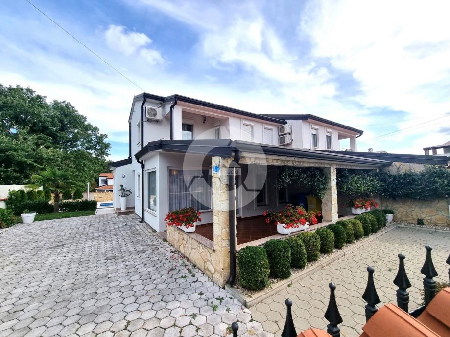 Dvojna kuća nalazi se svega nekoliko km od sadržaja grada Poreča (5 km) i mora (6 km), na izuzetno mirnoj lokaciji. Sastoji se od prizemlja i kata, iza kuće se nalazi vrtna kućica sa spremištima i bazen od 32 m2 sa vanjskim tušem. U prizemlju kuće se nalazi ulazni hodnik, spavaća soba, kupaona sa tušem, kuhinja, dnevni boravak, blagovaona iz koje se izlazi na prostranu otvorenu natrkivenu terasu pored koje se nalazi veliki vanjski kamin. U prizemlju se još nalazi spremište/praona i kotlovnica koja ima i izlaz na stražnji dio vrta gdje se nalazi vrtna kućica i bazen. Unutarnjim stepenicama se odlazi na kat gdje su smještene dvije spavaće sobe povezane sa zajedničkim balkonom, te kupaona sa kadom. Obje sobe na katu imaju klimu u sobi, a cijela kuća ima provedenu prvu fazu centralnog grijanja (instalacija i radijatori). Klima se nalazi i u prizemlju u prostoru dnevnog boravka. Stolarija je PVC. Kuća se prodaje sa namještajem i opremom. U dvorištu se osim roštilja, nakrivene terase, bazena i vrtne kućnice, nalaze i parkirna mjesta. Vrt je ograđen zidom i metalnim pokretnim vratima za ulaz na parking.