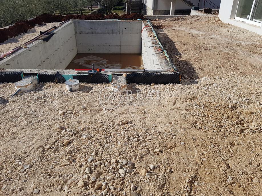 U prizemlju su smješteni hodnik, spavaća soba, kupaonica, spremište, kuhinja te prostrani dnevni boravak sa blagovaonom i izlazom na terasu i okućnicu na kojoj je smješten bazen.