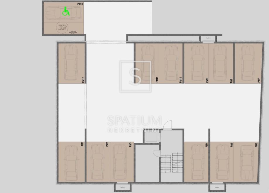 Na podzemnoj etaži nalazi se garaža s ukupno 13 parkirnih mjesta, uključujući i jedno mjesto za osobe s invaliditetom, dok se ispred zgrade nalazi šest dodatnih vanjskih parkirnih mjesta.
