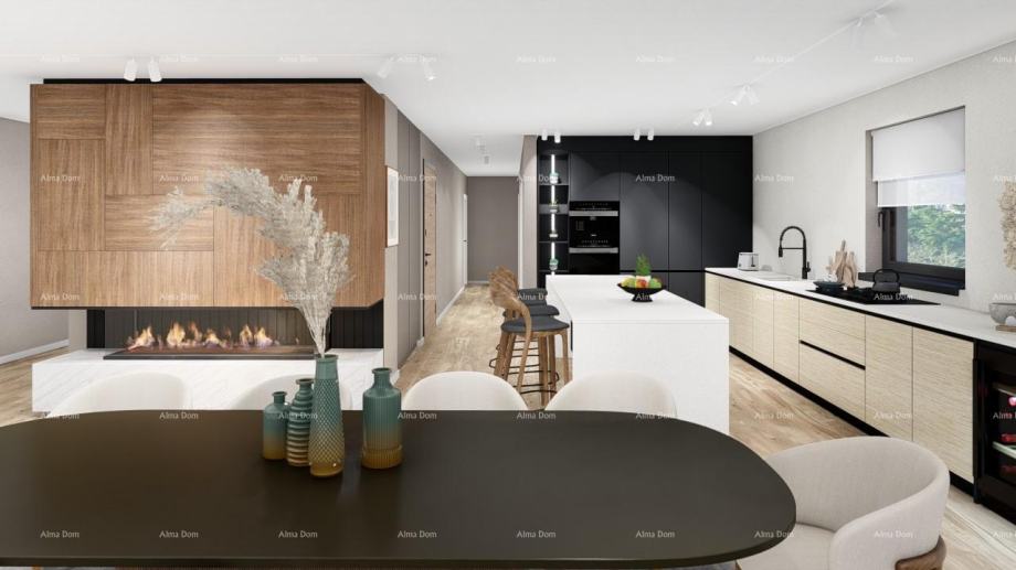 Penthouse se sastoji od velikog dnevnog boravka površine 68 m2, 5 spavaćih soba; svaka spavaća soba ima vlastito kupatilo. Prekrasna natkrivena terasa površine 29 m2 sa božanstvenim otvorenim pogledom od 180 stupnjeva na more i 1400 godina stari grad Poreč. Velika krovna terasa površine od 188 m2 daje osjećaj snage i moći jer se on nalazi iznad svih ostalih kuća i ima nesmetan i otvoren pogled od 180 stupnjeva na more i stari grad. Na toj krovnoj terasi ostavljeni su priključci tako da se može instalirati ljetna kuhinja, tuš i jacuzzi. Penthouse je zapravo kao kuća za nekoga tko ne voli zanimati se sa vrtom i ne želi imati troškove za održavanje, troškove zalijevanja i košnje trave. Visoka kvaliteta gradnje i dostupnost svih sadržaja; trgovački, kulturni, obrazovni i rekreacijski sadržaji potrebni za kvalitetan obiteljski život su elementi koji krase ovaj penthouse u ovoj urbanoj zgradi sa samo 5 stanova. Dolaskom svojim autom u garažu liftom se stiže do penthousa. Vlasnik penthousa ima ključ za ići liftom do penthousa i može ga samo on koristiti; drugi stanari ne mogu. Penthouse se prodaje bez namještaja jedino što je opremljena su kupatila.