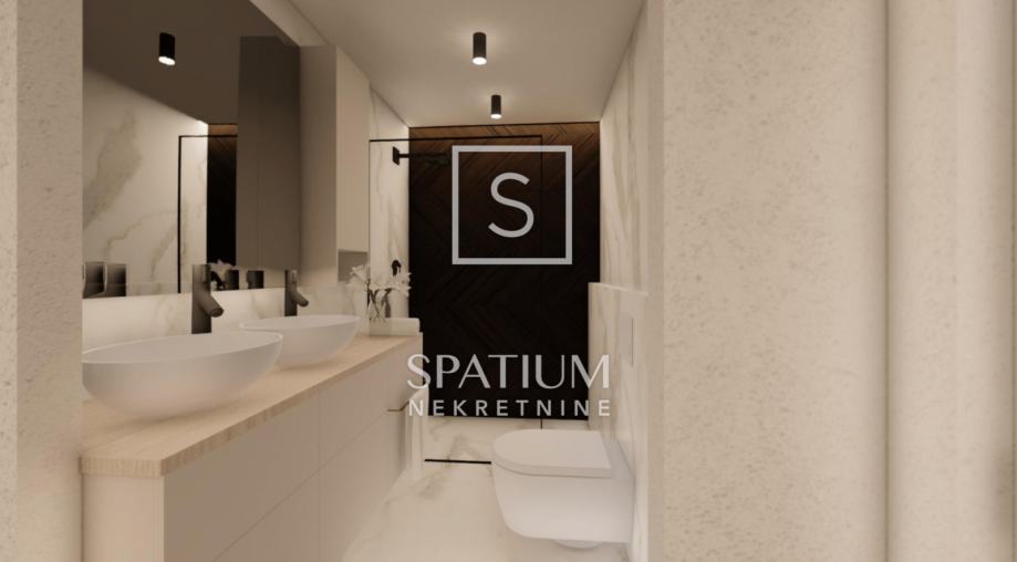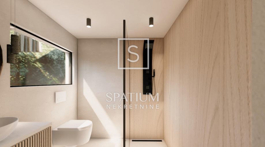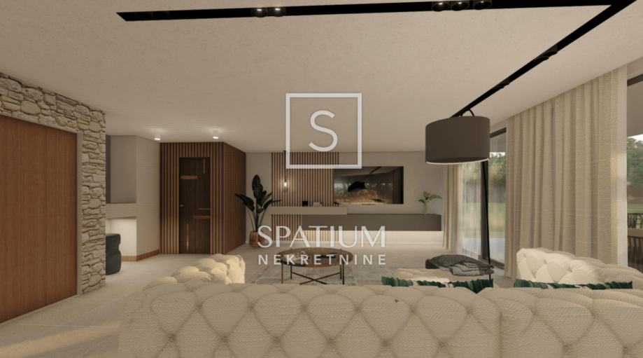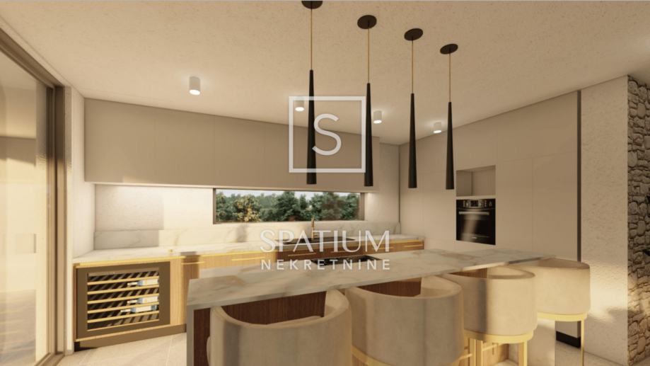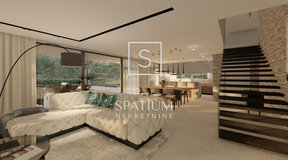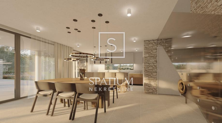 U prizemlju se nalazi elegantan ulazni prostor s garderobom, gostinjskim WC-om, tehničkom prostorijom te unutarnjim stepeništem. Središnji dio prizemlja čini veliki otvoreni prostor s kuhinjom i blagovaonicom te prostranim dnevnim boravkom koji, zahvaljujući velikim staklenim stijenkama, pruža obilje svjetla i povezuje interijer s eksterijerom. Iz dnevnog prostora izlazi se na natkrivenu terasu i vanjsku kuhinju, idealnu za ljetna druženja, a u sklopu okućnice smješten je bazen od 30 m² sa sunčalištem.