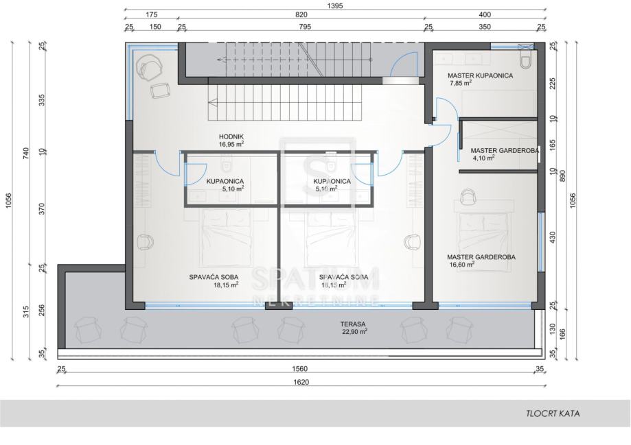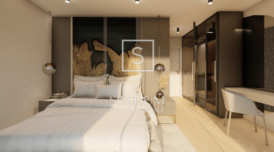 Na katu su tri komforne spavaće sobe, svaka s vlastitom kupaonicom. Master soba raspolaže i garderobom te pruža maksimalnu privatnost i udobnost. Sve spavaće sobe imaju izlaz na natkrivenu terasu s otvorenim pogledom na more, što dodatno naglašava ekskluzivnost i kvalitetu života u ovoj kući.