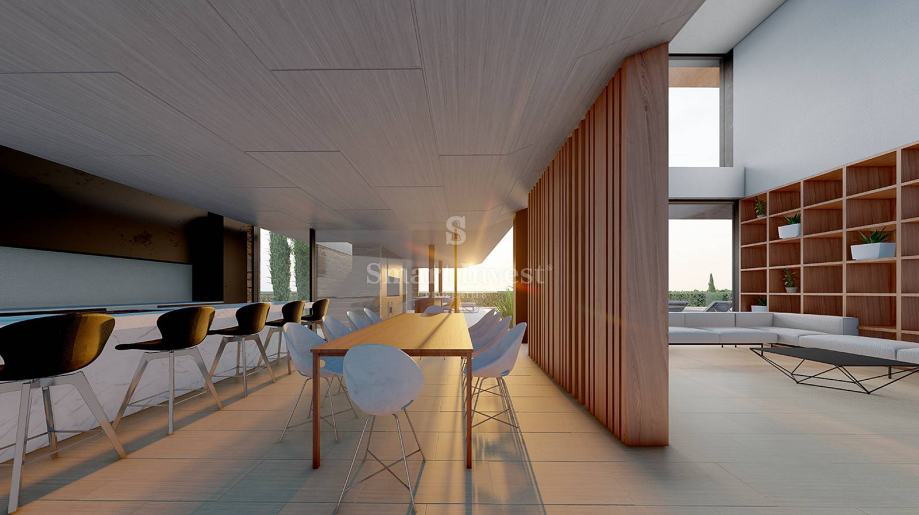 U prizemlju se nalazi natkriveni ulaz, ulazni pretprostor, prostrani dnevni boravak s kuhinjom i blagovaonicom, praonica, hodnik, sauna i teretana s kupaonicom, praonica, te jedna spavaća soba s vlastitom kupaonicom. Dnevni dio izlazi na prostranu natkrivenu terasu gdje se nalazi vanjska kuhinja i blagovaonica te prema sunčalištu i raskošnom bazenu. U prizemlju se nalazi također pomoćni dio (tehnička prostorija i WC) s odvojenim ulazom.