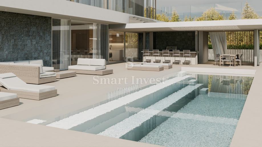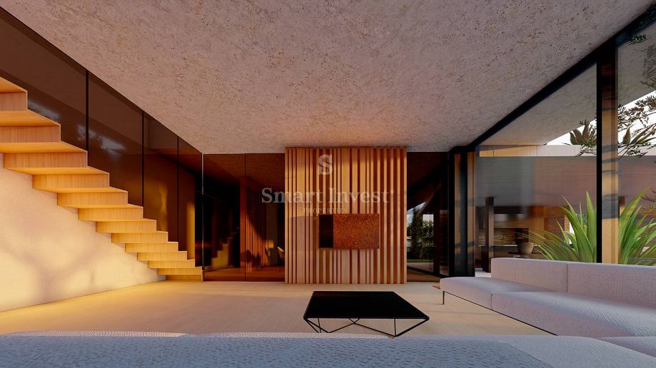 Ova vila predstavlja savršen spoj stila i funkcionalnosti koji se idealno uklapa u prirodno okruženje, a velike staklene stijene omogućuju bogatu prirodnu svjetlost obasjavajući svaki kutak prostora.