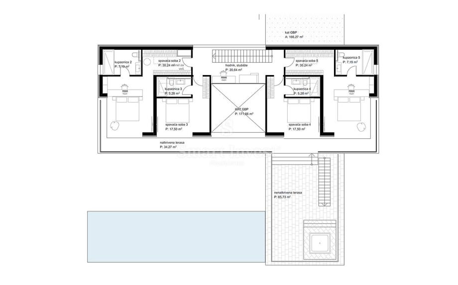 Na katu su smještene 4 komforne spavaće sobe, svaka s vlastitom kupaonicom i izlazom na prostranu zajedničku natkrivenu terasu koja prelazi u nenatkrivenu terasu sa sunčalištem i jakuzzijem koja je stepenicama povezana s prizemnim dijelom.