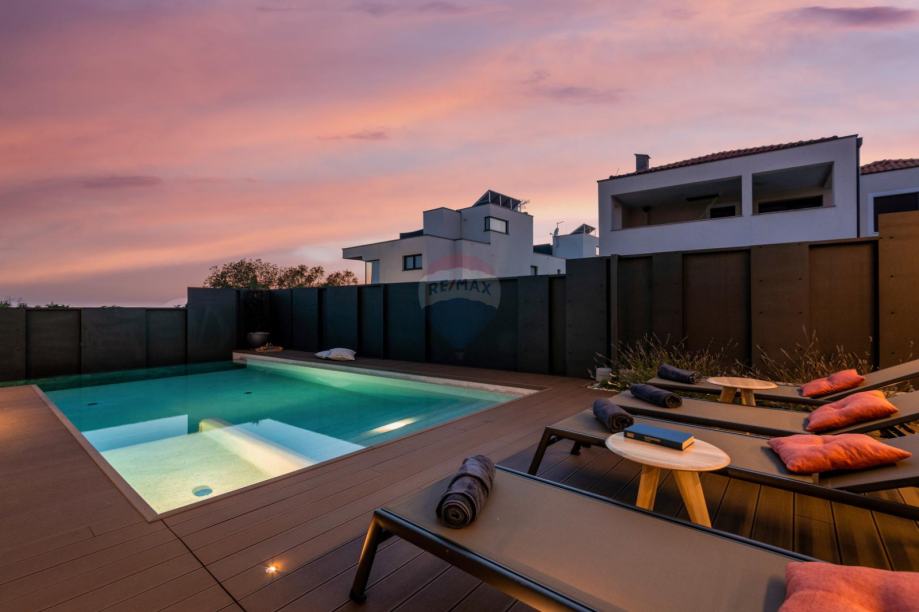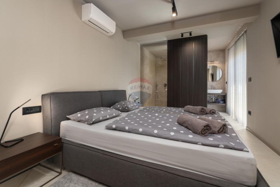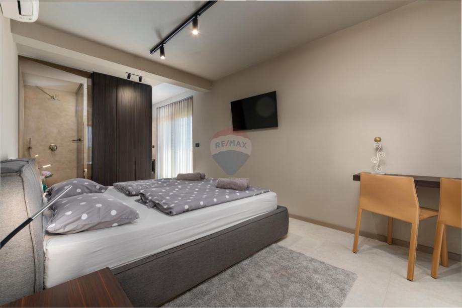 RE/MAX Centar nekretnina predstavlja ovu prekrasnu kuću u nadaleko poznatom turističkom gradu Poreču, na samo 600 m od mora i predivnih plaža. Pomno birana lokacija, na povišenom položaju pruža nesmetane poglede prema prirodi i moru. Vila je koncipirana od 2 zasebne stambene jedinice, svaka zadržavajući najviše standarde i komfor prostora. Već se s kapije kojom se upravlja mobilnim telefonom vidi da ulazimo u jedan luksuzan svijet gdje se vodilo brigu o svakom elementu u kući kako bi ugođaj i boravka bio na najvišim razinama opuštanja i uživanja u vlastitom prostoru. Raskoš se i elegancija protežu cijelom nekretninom. U prizemlju se nalazi dnevni dio po sistemu open space, s izlazom na terasu i dvorište gdje dominira zanimljivo osmišljen vanjski grijani bazen. Tu je smještena i ljetna kuhinja sa svim potrebnim elementima za uživanje u druženjima na otvorenom prostoru. U dnevnom djelu nalazi se i kamin za topli, domaćinski ugođaj u zimskim mjesecima. Vila je kompletno opremljena talijanskim vrhunskim namještajem po mjeri. Pored kuhinje postoje jedna skrivena vrata koja vode do fitnes prostorije. U cijeloj je kući postavljeno podno grijanje. Na katu nalaze se 2 spavaće sobe, veća master soba ima vlastitu kupaonicu i odvojen garderobni prostor. Prelijepi, otvoreni se pogledi pružaju prema okolnom zelenilu i moru. Na sljedećem se katu nalazi još jedna velika spavaća soba s kupaonicom u kojoj pažnju plijeni velika kada iz koje se pružaju očaravajući pogledi. Za napomenuti je da su vlasnici uz pretpostavku da možda klijentima neće biti neophodna fitnes soba ostavili i pripremili mogućnost da se iz iste izvede garaža za vozilo.