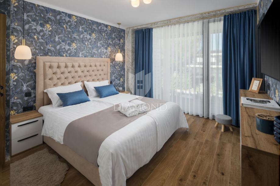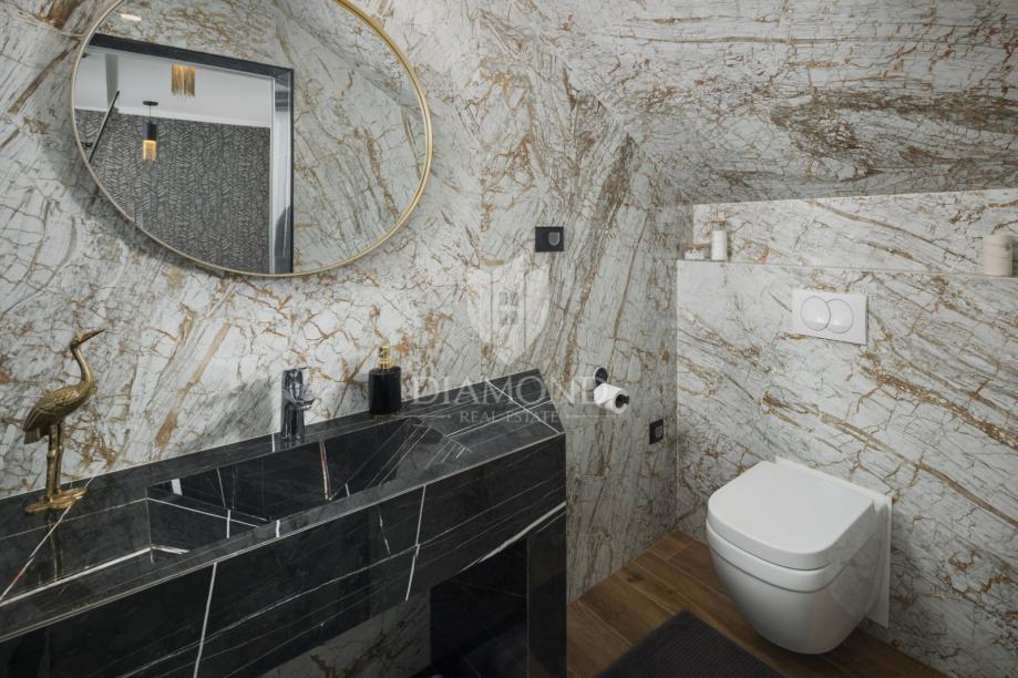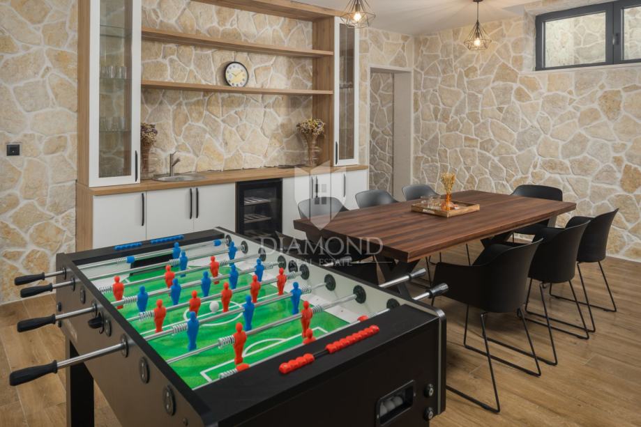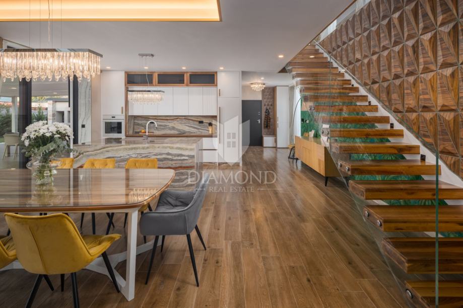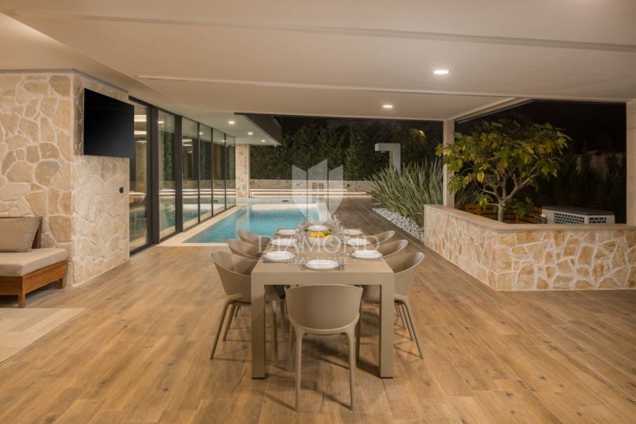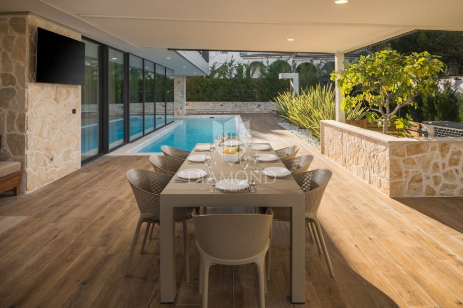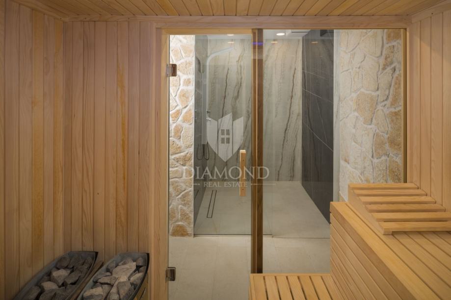 Iz dnevnog boravka izlazi se u njegovani vrt s privatnim bazenom i wellness zonu, savršenom za uživanje u potpunoj privatnosti. Grijanje i hlađenje kuće omogućeni su klima uređajima, a dodatno je instalirano podno grijanje. Solarni paneli osiguravaju ekološki prihvatljivo grijanje vode.